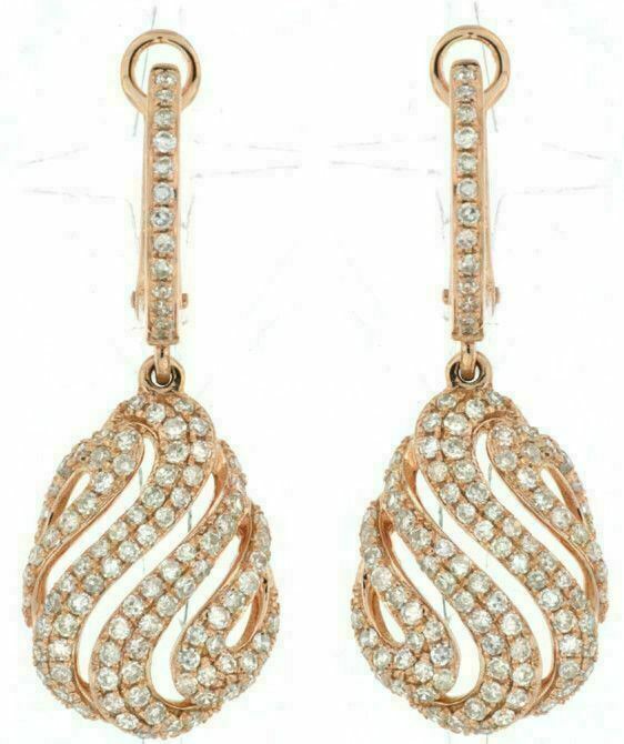 ESTATE 14KT ROSE GOLDHANGING EARRINGS. 3D MULTI ROW SWIRL TEAR DROP DESIGN. DIAMONDS ARE F/G COLOR, VSSI CLARITY .95 CARATS.WRITTEN APPRAISAL AVAILABLE. COMES IN A PRESENTABLE GIFT BOX.
