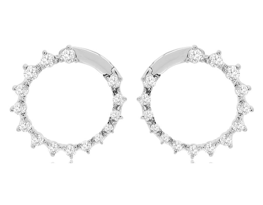 ESTATE 14KT WHITE GOLD HOOP HANGING EARRINGS. 3D SIDEWAYS DESIGN. ROUND DIAMONDS ARE F/G COLOR, VSSI CLARITY .95 CARATS. WRITTEN APPRAISAL AVAILABLE. COMES IN A PRESENTABLE GIFT BOX.