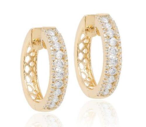ESTATE 14KT YELLOW GOLD HUGGIE HOOP HANGING EARRINGS. 3D CLASSIC THREE ROW DESIGN. DIAMONDS ARE F/G COLOR, VSSI CLARITY .95 CARATS. WRITTEN APPRAISAL AVAILABLE. COMES IN A PRESENTABLE GIFT BOX.