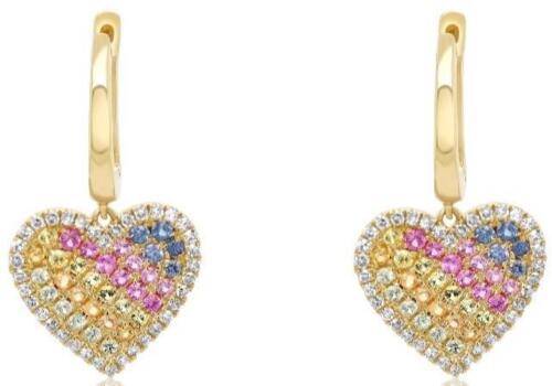 ESTATE 14KT YELLOW GOLD HANGING EARRINGS. 3D HEART SHAPE RAINBOW DESIGN. DIAMONDS ARE F/G COLOR, VSSI CLARITY .29 CARATS. AAA MULTI COLOR SAPPHIRES ARE .66 CARATS. WRITTEN APPRAISAL AVAILABLE. COMES IN A PRESENTABLE GIFT BOX.