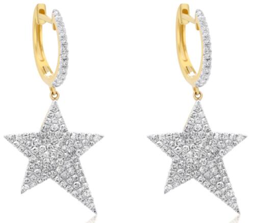 ESTATE 14KT YELLOW GOLD FUN HUGGIE HANGING EARRINGS. 3D CLASSIC STAR DESIGN. DIAMONDS ARE F/G COLOR, VSSI CLARITY .96 CARATS. WRITTEN APPRAISAL AVAILABLE. COMES IN A PRESENTABLE GIFT BOX.