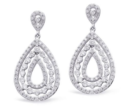 ESTATE 14KT WHITE GOLD FUN HANGING EARRINGS. 3D CLASSIC OPEN TEAR DROP DESIGN. DIAMONDS ARE F/G COLOR, VSSI CLARITY .96 CARATS. MEASURES 13mm WIDE. WRITTEN APPRAISAL AVAILABLE. COMES IN A PRESENTABLE GIFT BOX.