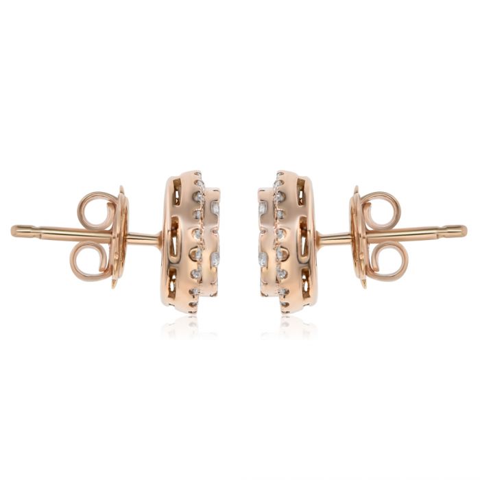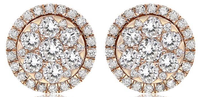 ESTATE 18KT ROSE GOLD STUDEARRINGS. 3D ROUND CLUSTER CLASSIC HALODESIGN. DIAMONDS ARE F/G COLOR, VSSI CLARITY .96 CARATS. WRITTEN APPRAISAL AVAILABLE. COMES IN A PRESENTABLE GIFT BOX.