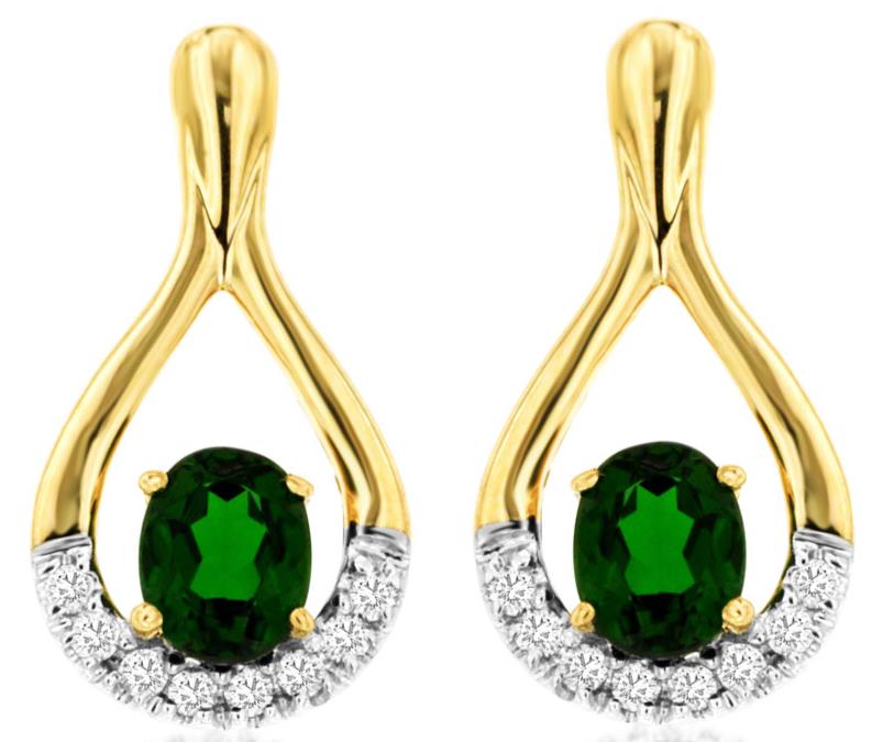 ESTATE 14KT YELLOW GOLD HANGING EARRINGS. 3D TEAR DROP DESIGN. ROUND DIAMONDS ARE F/G COLOR, VSSI CLARITY .12 CARATS. AAA EXTRA FACTED OVAL RUSSALITES ARE .85 CARATS. WRITTEN APPRAISAL AVAILABLE. COMES IN A PRESENTABLE GIFT BOX.
