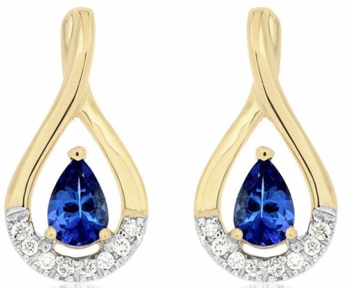 ESTATE 14KT YELLOW GOLD HANGING EARRINGS. 3D TEAR DROP DESIGN. ROUND DIAMONDS ARE F/G COLOR, VSSI CLARITY .12 CARATS. AAA PEAR SHAPE TANZANITES ARE .85 CARATS. WRITTEN APPRAISAL AVAILABLE. COMES IN A PRESENTABLE GIFT BOX.