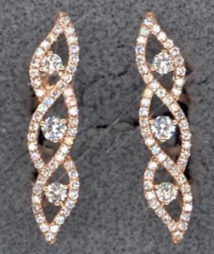 ESTATE 18KT ROSE GOLD LOVE HANGING EARRINGS. 3D PAST PRESENT FUTURE DESIGN. DIAMONDS ARE F/G COLOR, VSSI CLARITY .98 CARATS. WRITTEN APPRAISAL AVAILABLE. COMES IN A PRESENTABLE GIFT BOX.