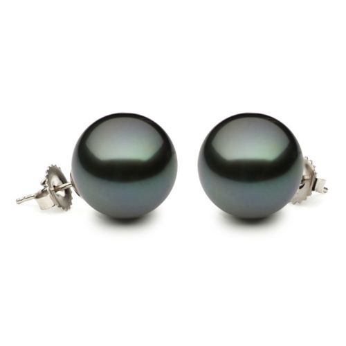 ESTATE 14KT WHITE GOLD STUD EARRINGS. 3D CLASSIC ROUND SOLITAIRE DESIGN. AAA TAHITIAN PEARLS ARE 13-13.5MM WIDE. WRITTEN APPRAISAL AVAILABLE. COMES IN A PRESENTABLE GIFT BOX.