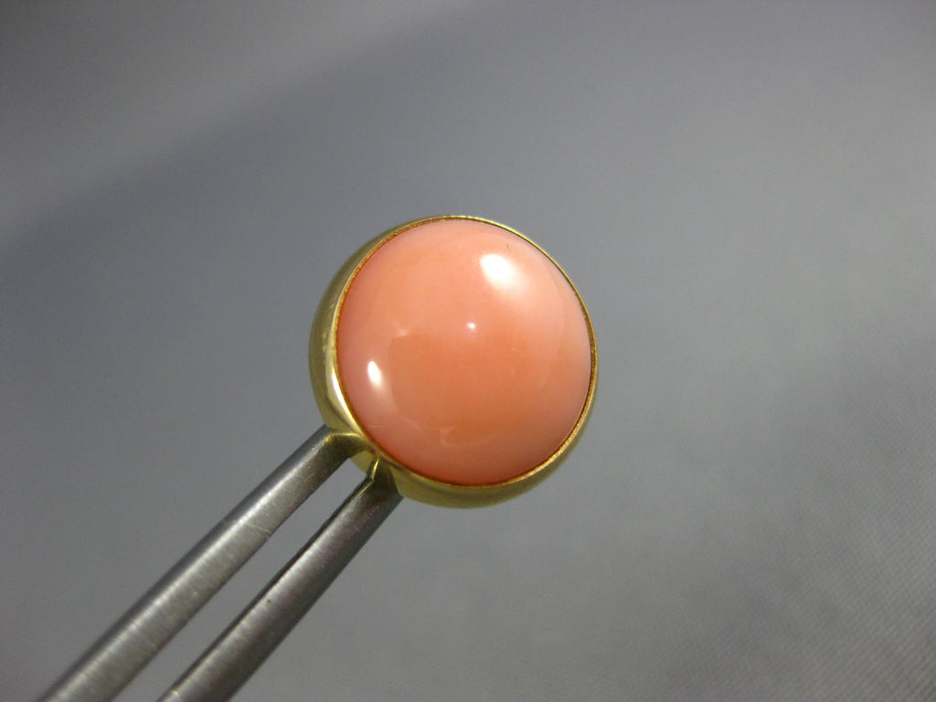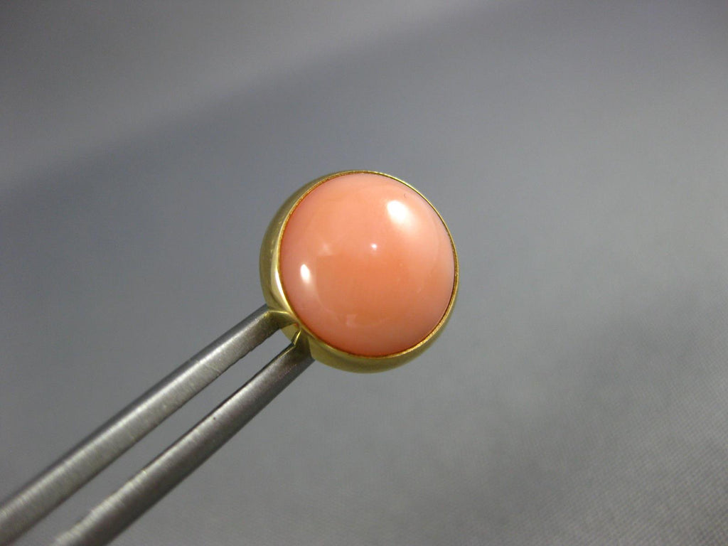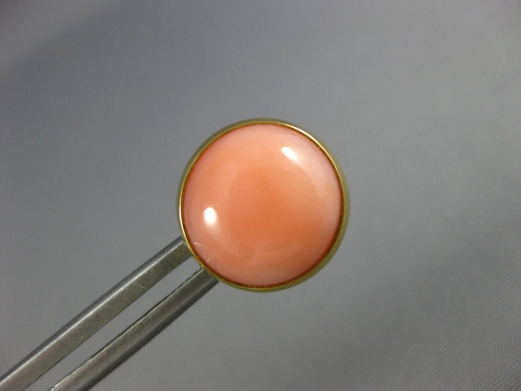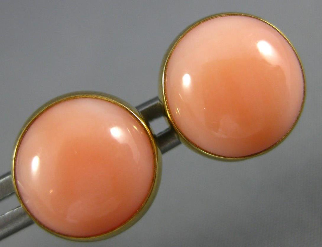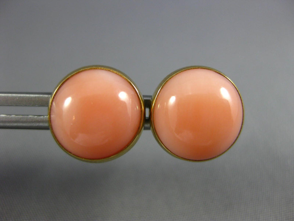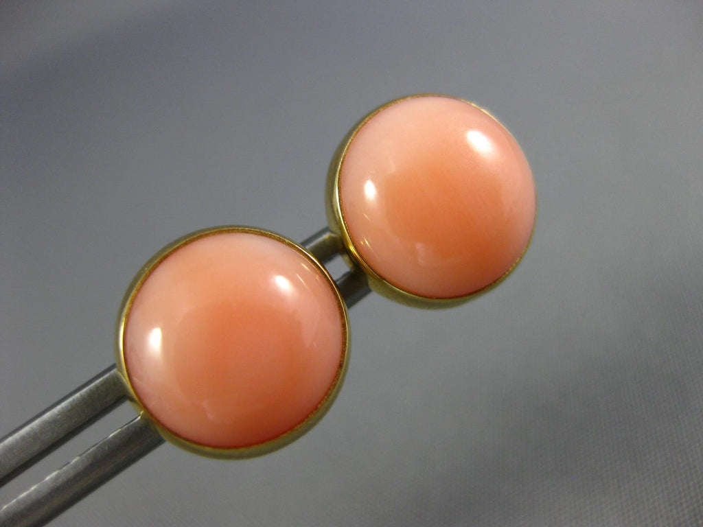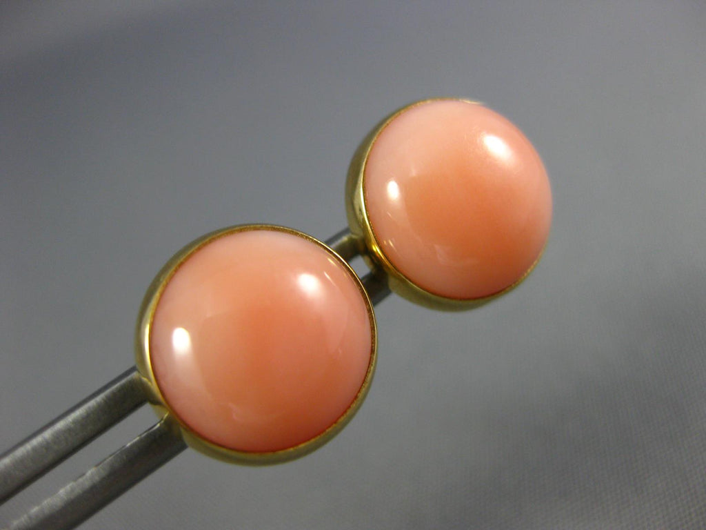 ESTATE 14KT YELLOW GOLD STUD EARRINGS. 3D ROUND BEZEL CLASSIC DESIGN. FEATURES AAA CABOCHON CORAL. MEASURES 11mm WIDE. WRITTEN APPRAISAL AVAILABLE. COMES IN A PRESENTABLE GIFT BOX.