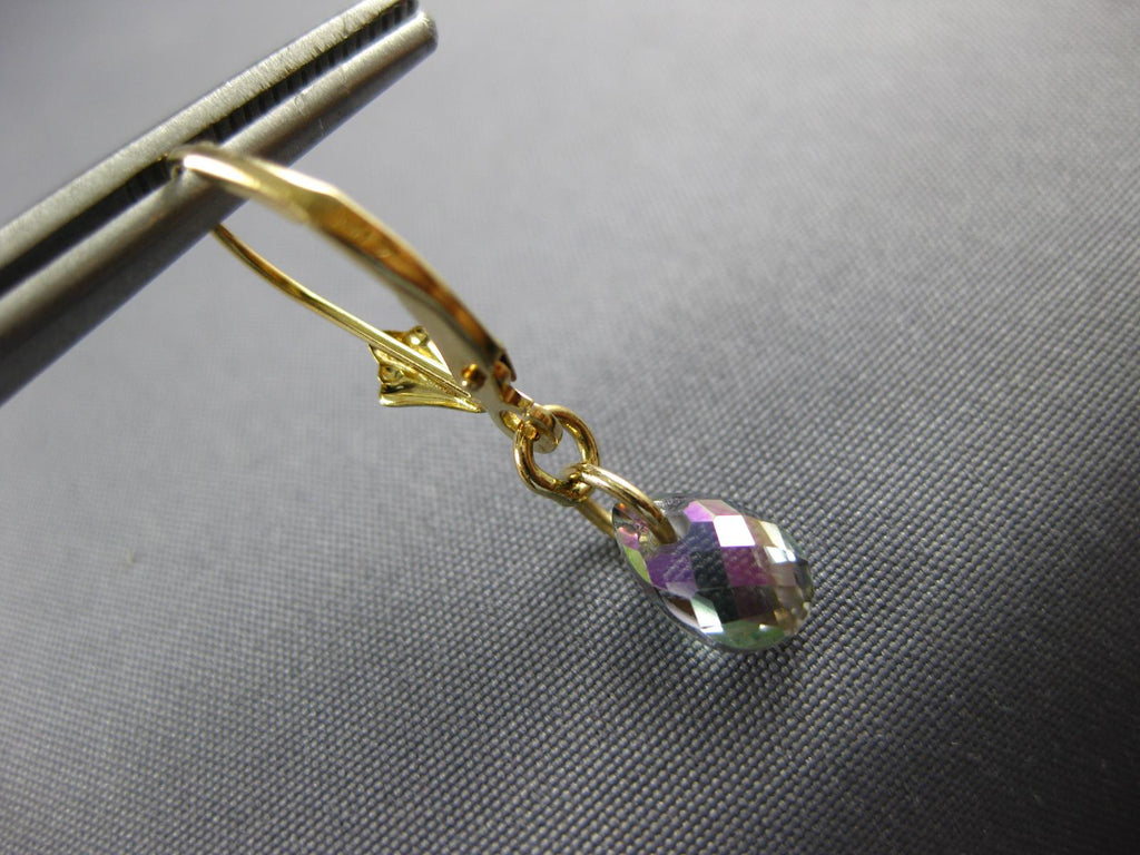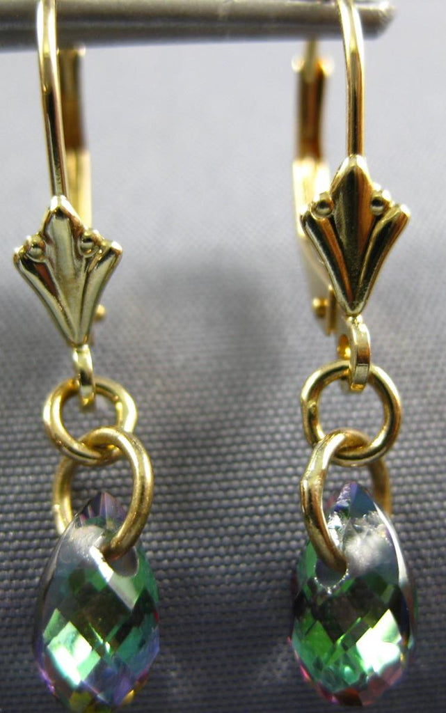 ESTATE 14KT YELLOW GOLD HANGING EARRINGS. 3D TEAR DROP LEVERBACK DESIGN. FEATURES AAA EXTRA FACETED MYSTIC TOPAZ. MEASURES 28mm LONG. WRITTEN APPRAISAL AVAILABLE. COMES IN A PRESENTABLE GIFT BOX.