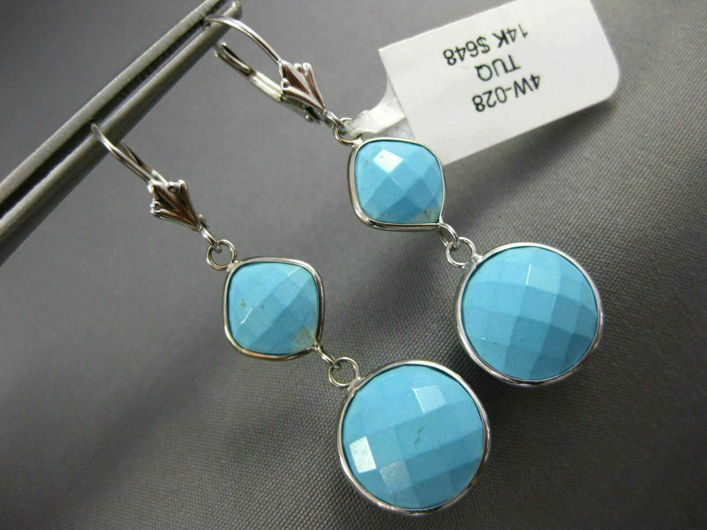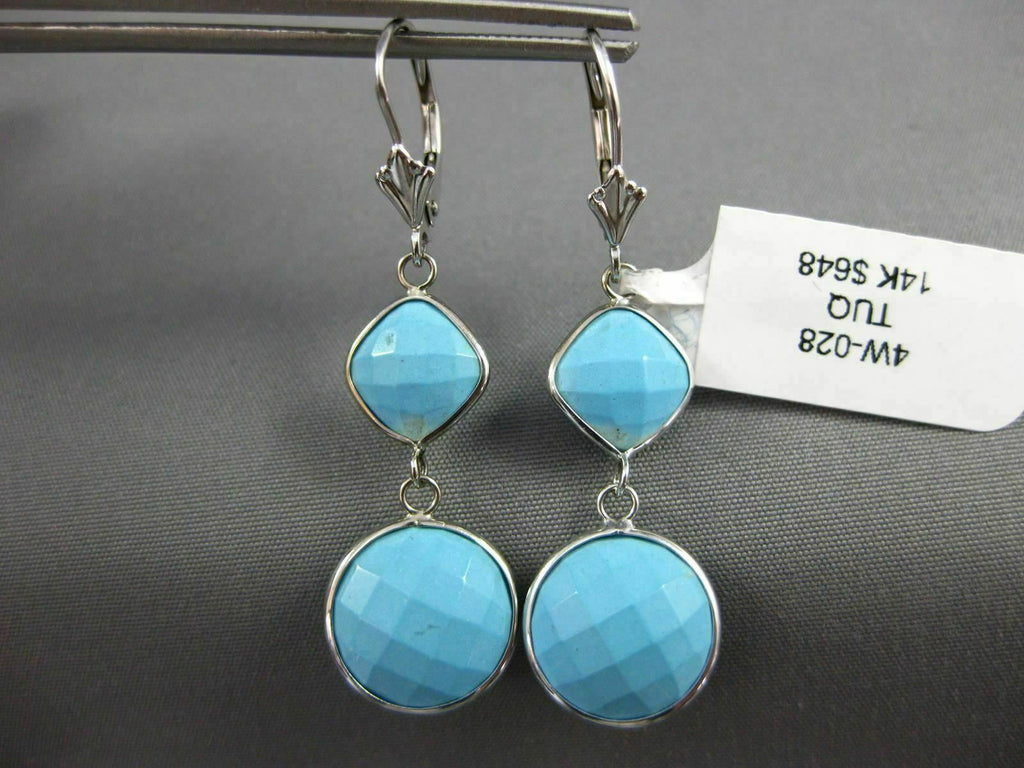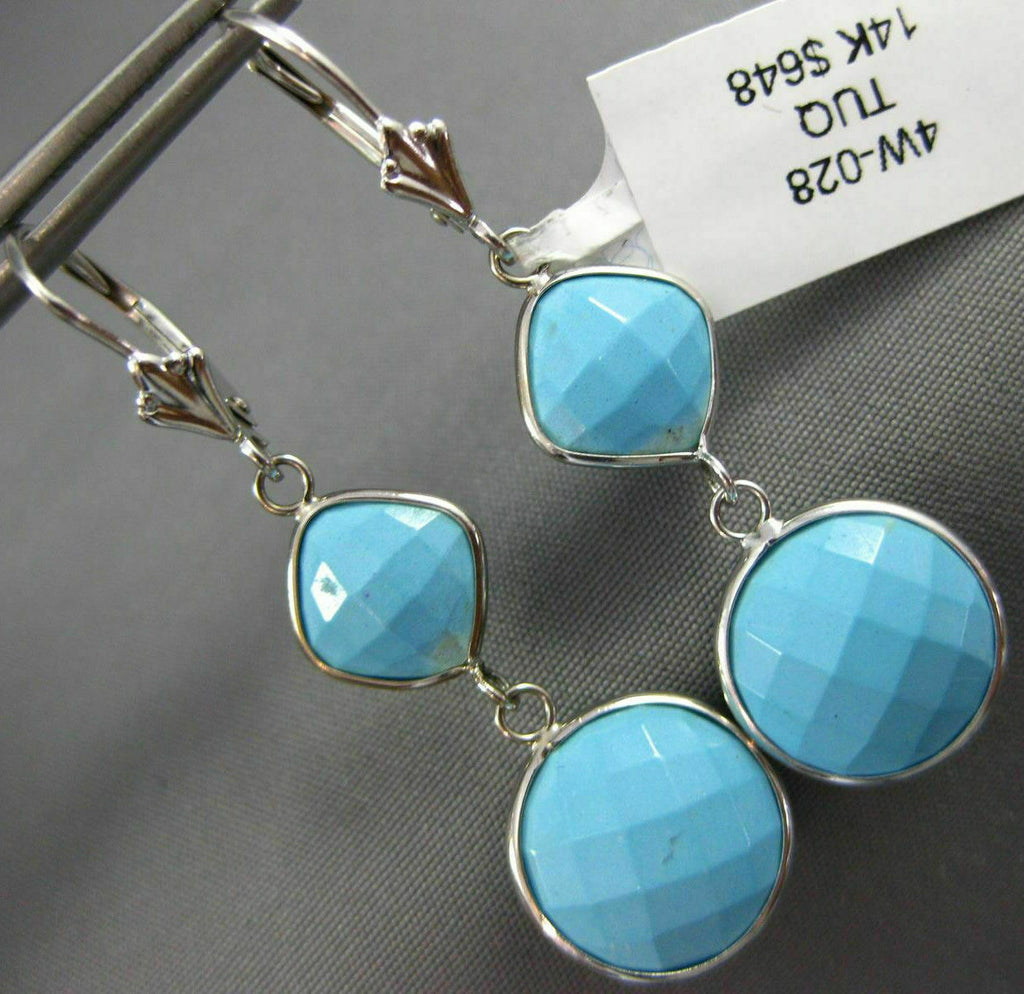ESTATE 14KT WHITE GOLD LEVER BACK HANGING EARRINGS. 3D CLASSIC SQUARE AND ROUND DESIGN. FEATURES AAA TURQUOISE. MEASURES 45mm X 12mm. WRITTEN APPRAISAL AVAILABLE. COMES IN A PRESENTABLE GIFT BOX