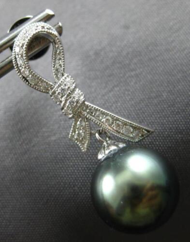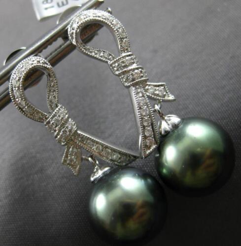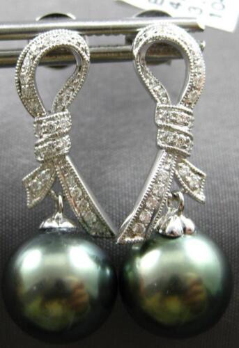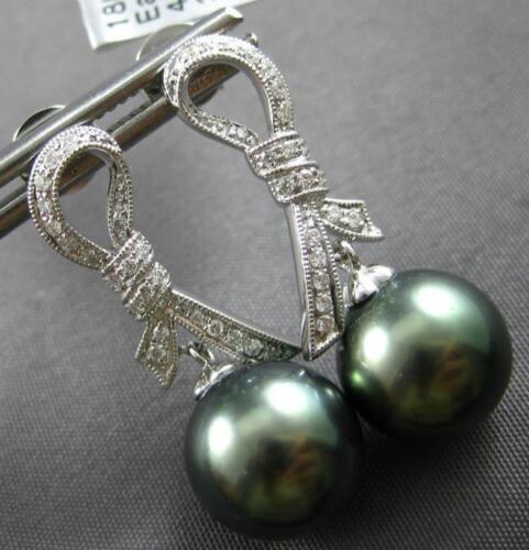 ESTATE 18KT WHITE GOLD HANGING EARRINGS. 3D CLASSIC BOW DESIGN. DIAMONDS ARE F/G COLOR, VSSI CLARITY .23 CARATS. FEATURES AAA 10.5mm WIDE TAHITIAN PEARLS. EARRINGS MEASURE 28mm X 10.5mm. WRITTEN APPRAISAL AVAILABLE. COMES IN A PRESENTABLE GIFT BOX.
