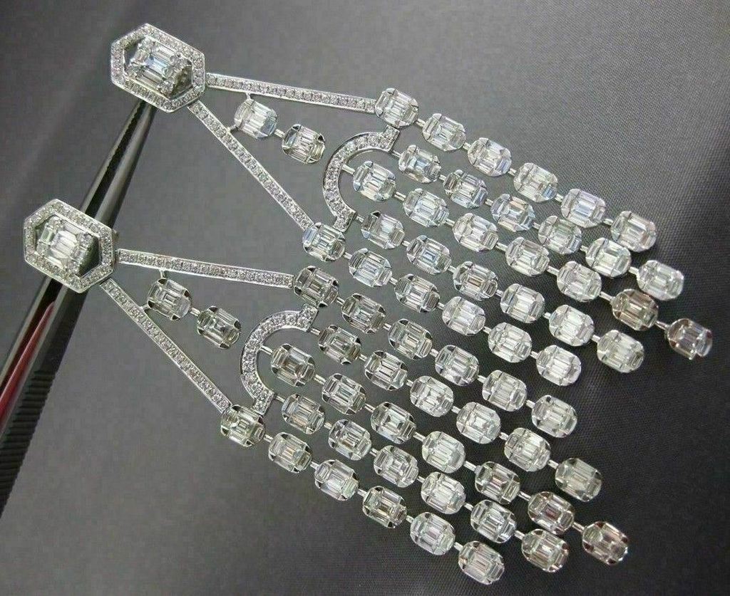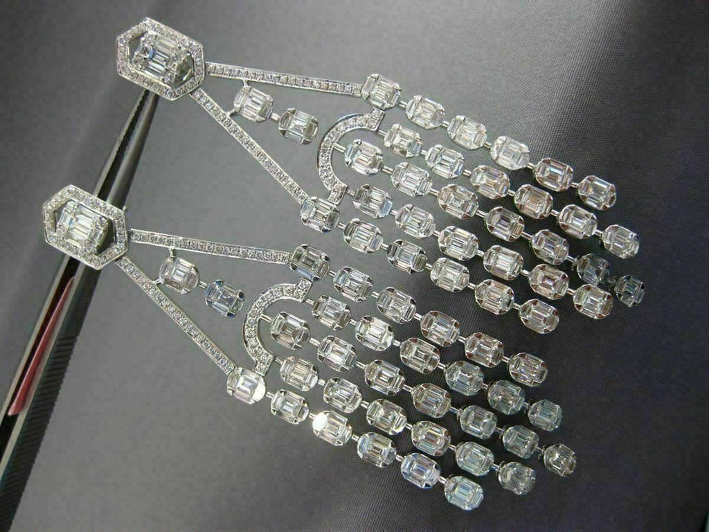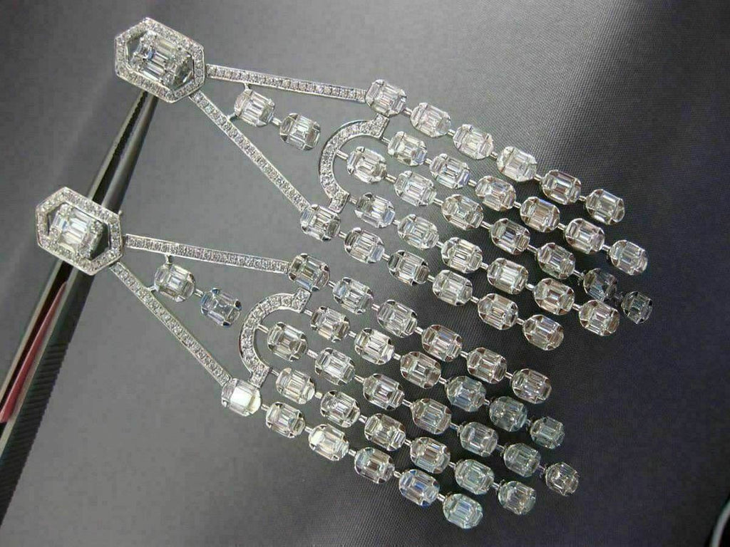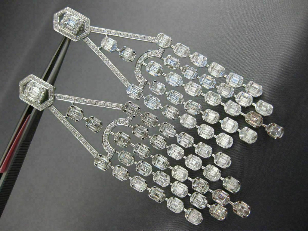 ESTATE EXTRA LARGE 18KT WHITE GOLD EARRINGS. 3D ELONGATED CHANDELIERDESIGN. ROUND AND BAGUETTEDIAMONDS ARE F/G COLOR, VSSI CLARITY 12.03 CARATS. MEASURES 85mm X 24mm. WRITTEN APPRAISAL AVAILABLE. COMES IN A PRESENTABLE GIFT BOX.