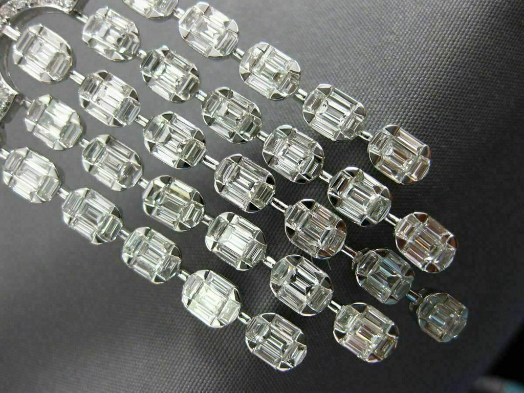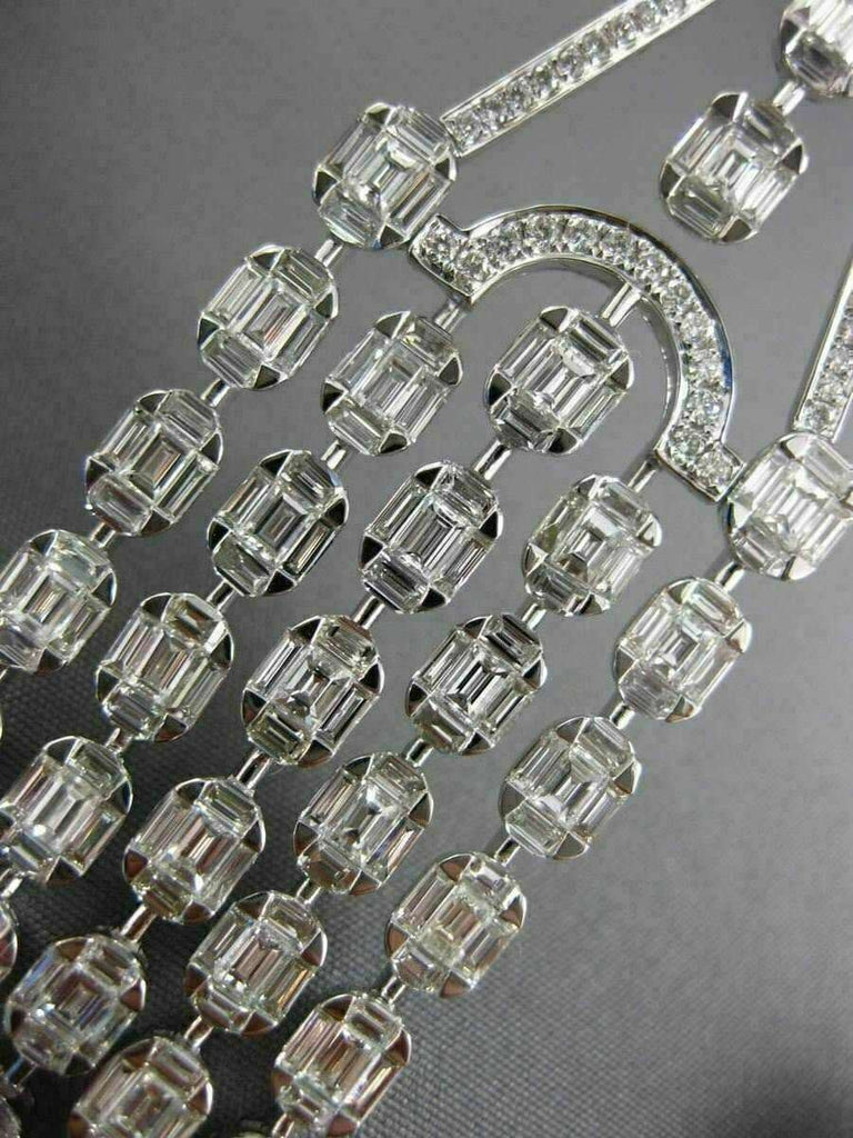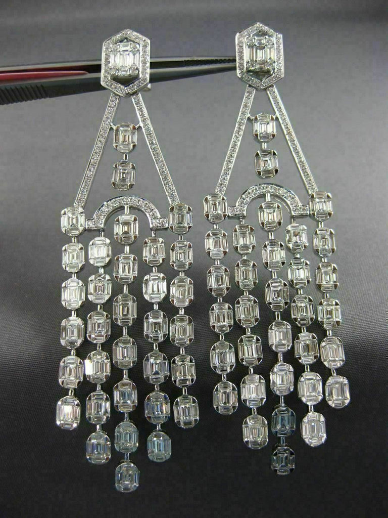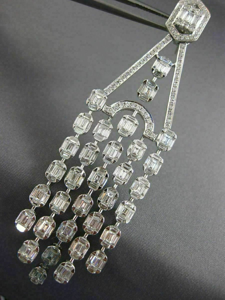 ESTATE EXTRA LARGE 18KT WHITE GOLD EARRINGS. 3D ELONGATED CHANDELIERDESIGN. ROUND AND BAGUETTEDIAMONDS ARE F/G COLOR, VSSI CLARITY 12.03 CARATS. MEASURES 85mm X 24mm. WRITTEN APPRAISAL AVAILABLE. COMES IN A PRESENTABLE GIFT BOX.
