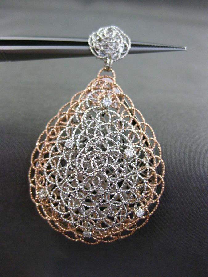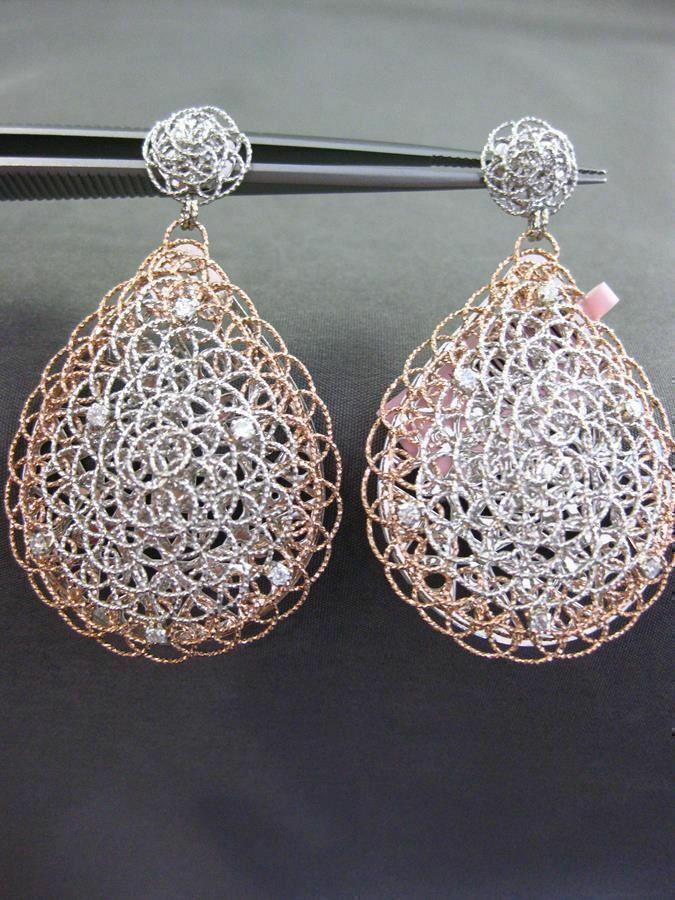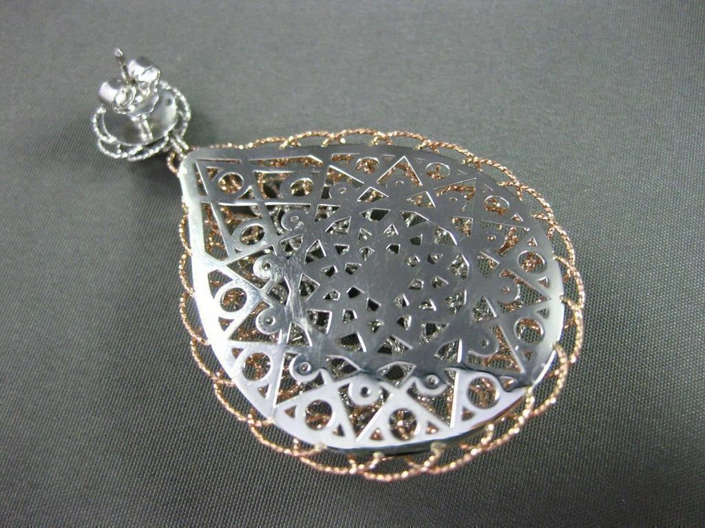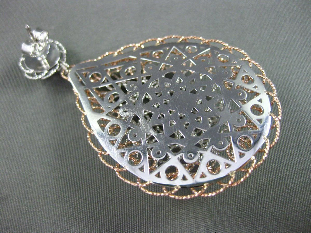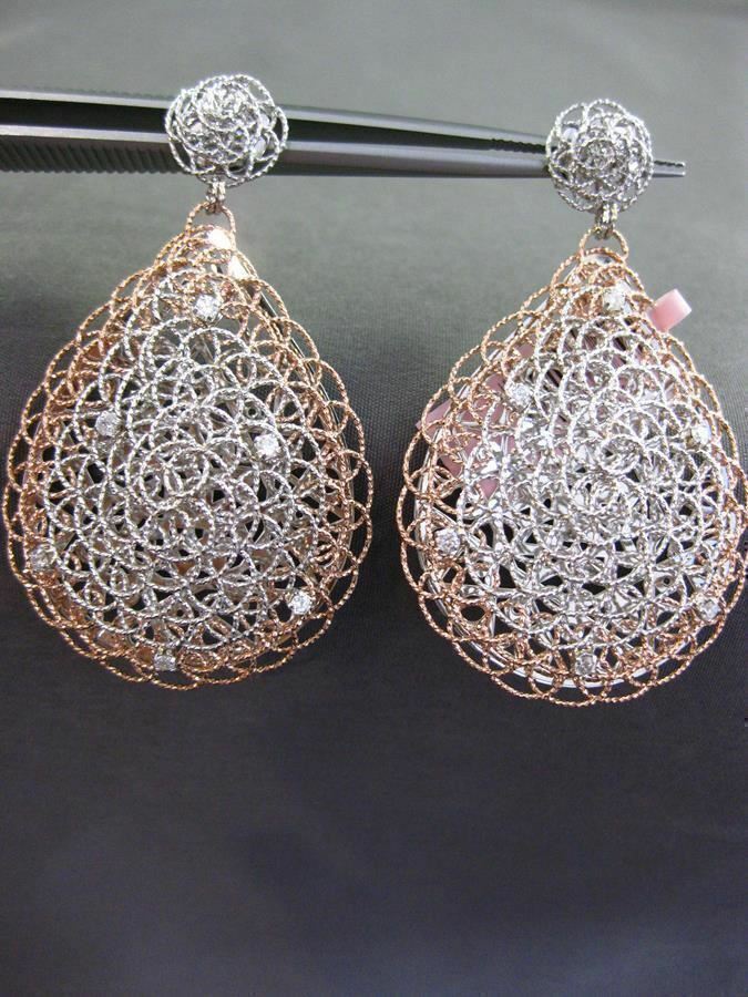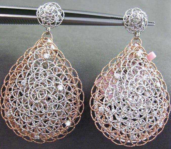 ESTATE EXTRA LARGE 14KT WHITE AND ROSE GOLD DROP HANGING EARRINGS. 3D INTERTWINING PEAR SHAPE ETOILE WOVEN DESIGN. DIAMOND ARE F/G COLOR, VSSI CLARITY .36 CARATS. MADE IN ITALY. MEASURES 55mm x 32mm. WRITTEN APPRAISAL AVAILABLE. COMES IN A PRESENTABLE GIFT BOX