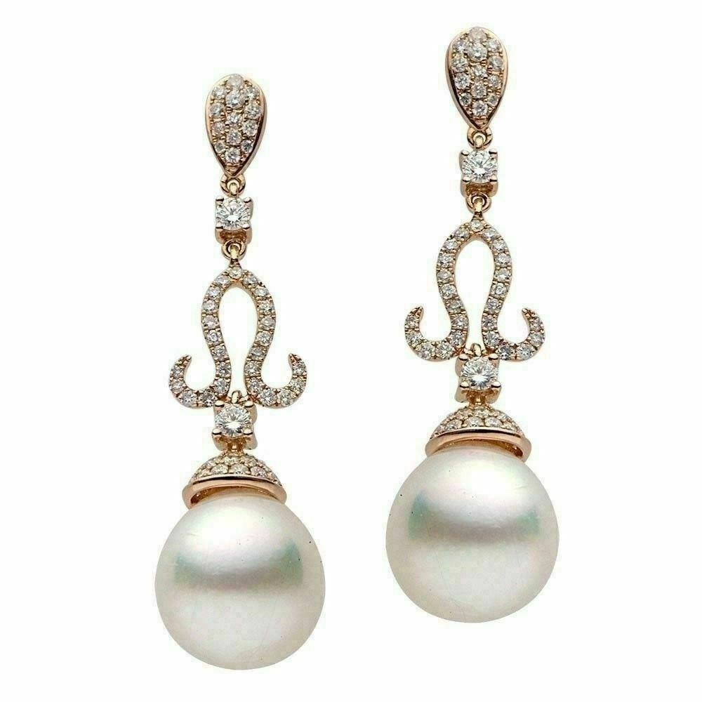 ESTATE LARGE 18KT ROSE GOLD HANGING EARRINGS. 3D ROUND OPEN FILIGREE PAVE TEAR DROP DESIGN. DIAMONDS ARE F/G COLOR, VSSI CLARITY 1.04 CARATS. AAA SOUTH SEA PEARLS ARE 13-14MM WIDE. WRITTEN APPRAISAL AVAILABLE. COMES IN A PRESENTABLE GIFT BOX
