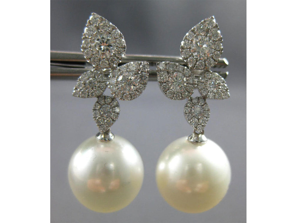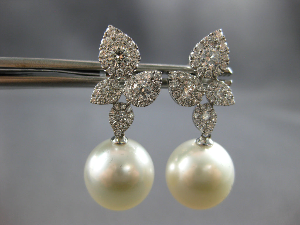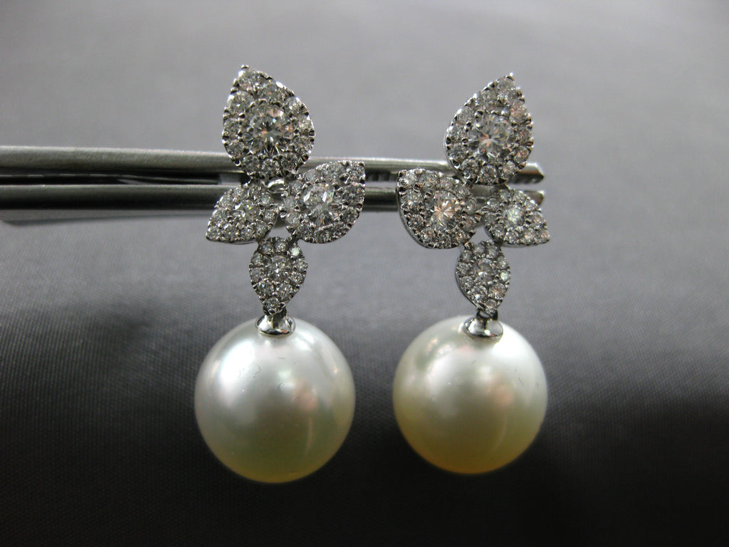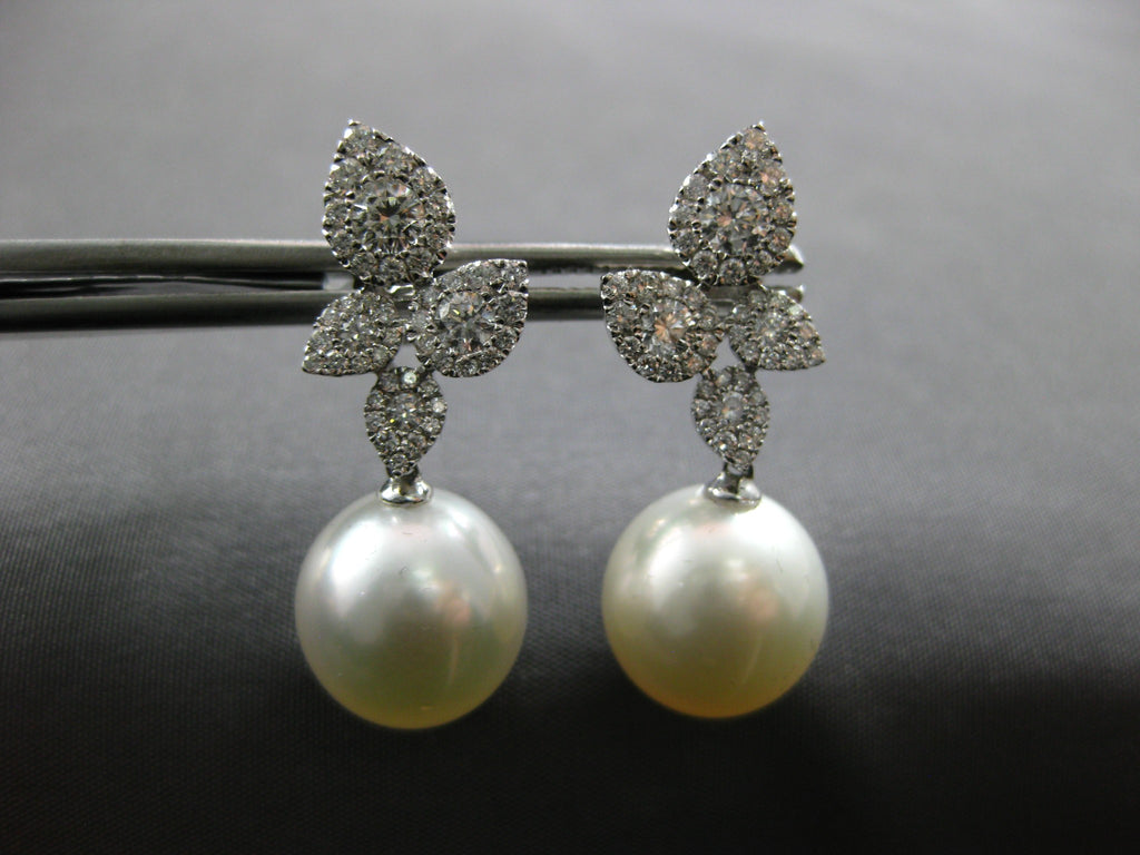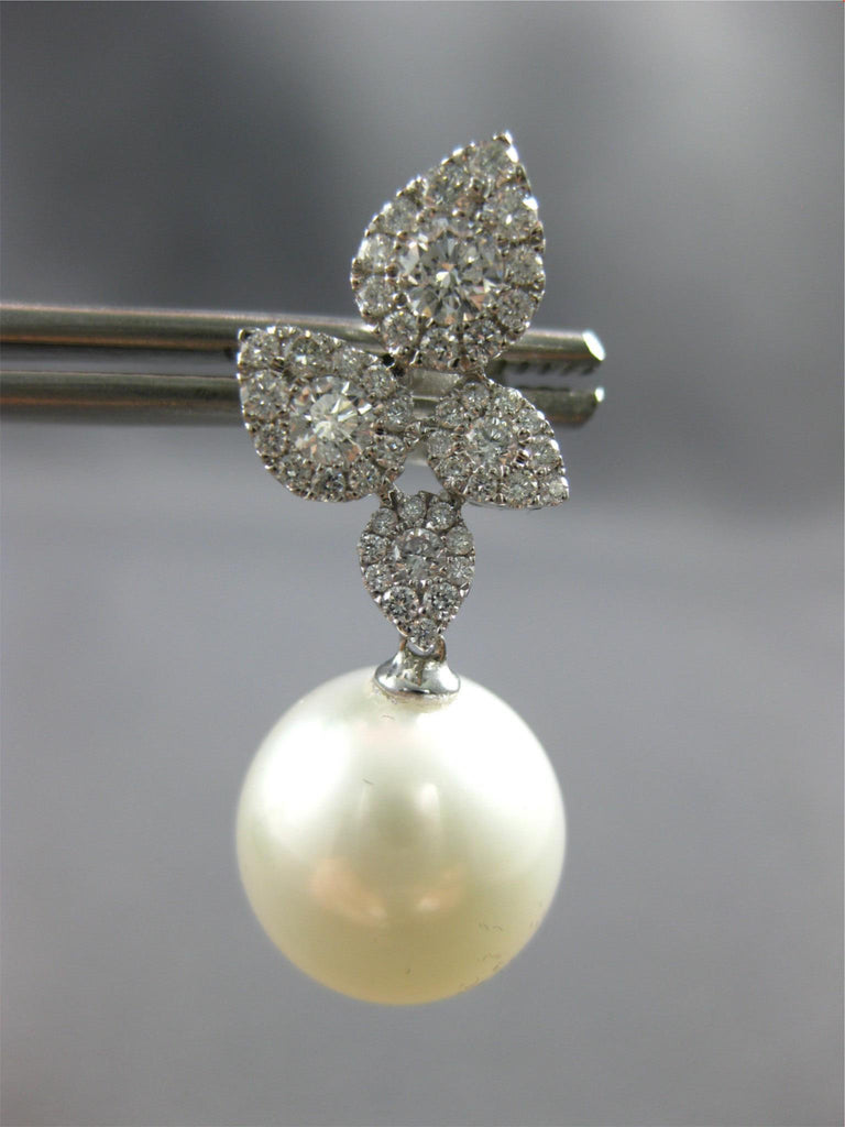 LARGE 18KT WHITE GOLD HANGING EARRINGS. 3D MULTI LEAF DESIGN. DIAMONDS ARE F/G COLOR, VSSI CLARITY 1.05 CARATS. FEATURES AAA SOUTH SEA PEARL. SOUTH SEA PEARLS MEASURE 11.5mm WIDE. EARRINGS MEASURE 29.5mm X 11.5mm. WRITTEN APPRAISAL AVAILABLE. COMES IN A PRESENTABLE GIFT BOX.