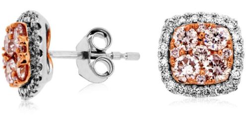 ESTATE LARGE 14KT WHITE GOLD STUD EARRINGS. 3D SQUARE CLUSTER HALO CLASSIC DESIGN. DIAMONDS ARE F/G COLOR, VSSI CLARITY .25 CARATS. PINK DIAMONDS ARE .83 CARATS. WRITTEN APPRAISAL AVAILABLE. COMES IN A PRESENTABLE GIFT BOX.