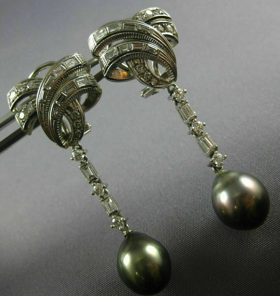 EXTRA LARGE 14KT WHITE GOLD HANGING EARRINGS. 3D CLASSIC DESIGN. ROUND AND BAGUETTE DIAMONDS ARE F/G COLOR, VVS/VS CLARITY 1.0 CARATS. FEATURES AAA TAHITIAN PEARL. MEASURES 52mm X 18mm. WRITTEN APPRAISAL AVAILABLE. COMES IN A PRESENTABLE GIFT BOX