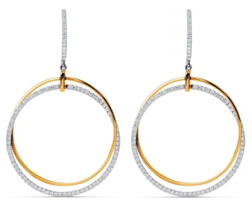 ESTATE LARGE 18KT WHITE AND YELLOW GOLD HANGING EARRINGS. 3D CIRCULAR INTERTWINING DESIGN. DIAMONDS ARE F/G COLOR, VSSI CLARITY 1.10 CARATS. WRITTEN APPRAISAL AVAILABLE. COMES IN A PRESENTABLE GIFT BOX.