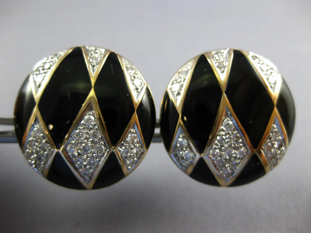 ESTATE LARGE 14KT WHITE AND YELLOWGOLD FUN EARRINGS. 3D CIRCULAR DESIGN. DIAMONDS ARE F/G COLOR, VS CLARITY 1.10 CARATS. FEATURES AAA BLACK ENAMEL.MEASURES 24mm WIDE. WRITTEN APPRAISAL AVAILABLE. COMES IN A PRESENTABLE GIFT BOX.