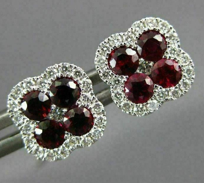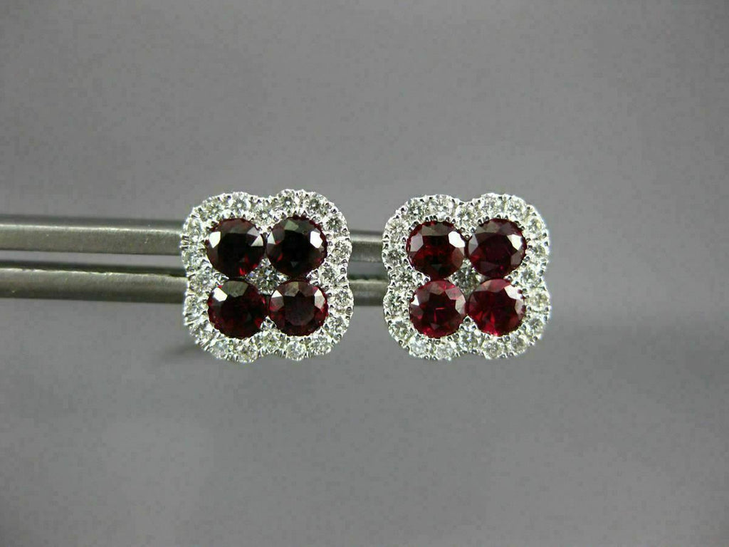 ESTATE LARGE 18KT WHITE GOLD EARRINGS. 3D CLASSIC SQUARE FLOWER DESIGN. DIAMONDS ARE F/G COLOR, VSSI CLARITY .25 CARATS. AAA RUBIES ARE .90 CARATS. MEASURES 8MM WIDE. WRITTEN APPRAISAL AVAILABLE. COMES IN A PRESENTABLE GIFT BOX.