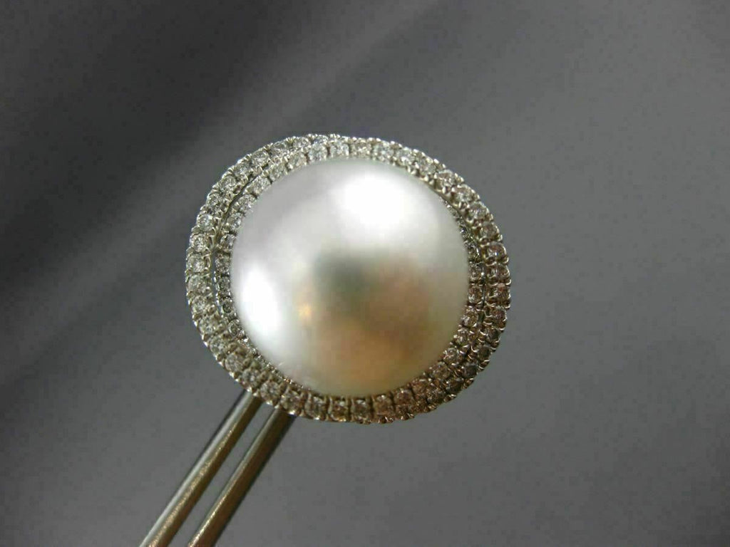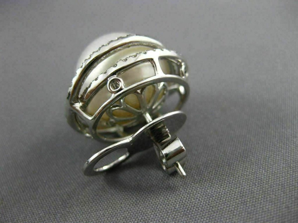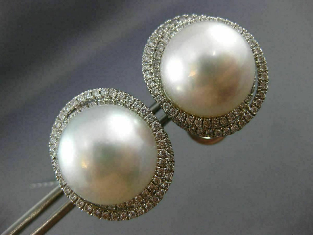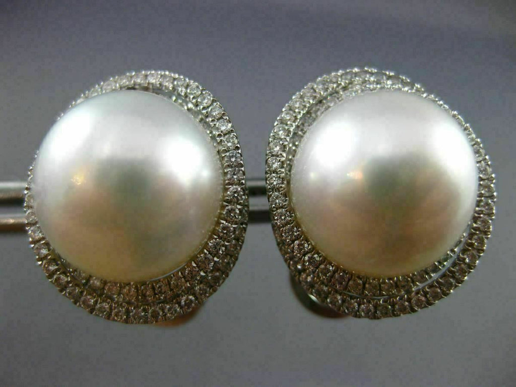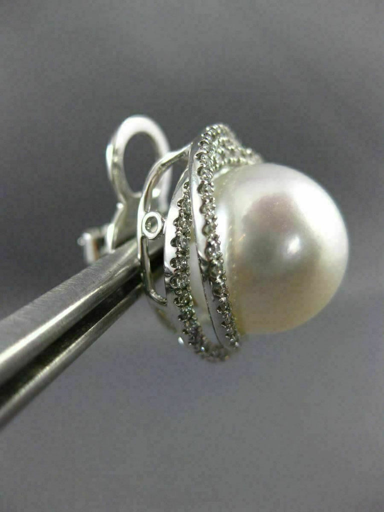ESTATE LARGE 18KT WHITE GOLD FUN STUD EARRINGS. 3D CLASSIC DOUBLE SWIRL DESIGN. DIAMONDS ARE F/G COLOR, VSSI CLARITY 1.15 CARATS. AAA SOUTH SEA PEARLS ARE 13.50MM WIDE. MEASURES 20MM X 18MM. WRITTEN APPRAISAL AVAILABLE. COMES IN A PRESENTABLE GIFT BOX.