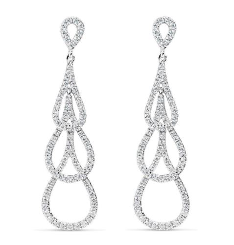 ESTATE LARGE 18KT WHITE GOLD HANGING EARRINGS. 3D MULTI ROW SWIRL DESIGN. DIAMONDS ARE F/G COLOR, VSSI CLARITY 1.30 CARATS. WRITTEN APPRAISAL AVAILABLE. COMES IN A PRESENTABLE GIFT BOX.