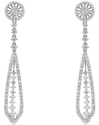 ESTATE LARGE18KT WHITEGOLD FUN HANGINGEARRINGS. 3D FLOWERDESIGN. DIAMONDS ARE F/G COLOR, VSSI CLARITY 1.53 CARATS. WRITTEN APPRAISAL AVAILABLE. COMES IN A PRESENTABLE GIFT BOX.