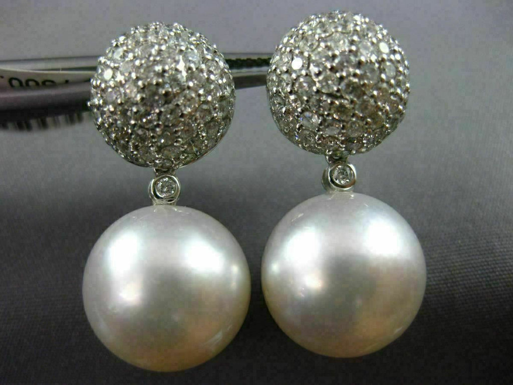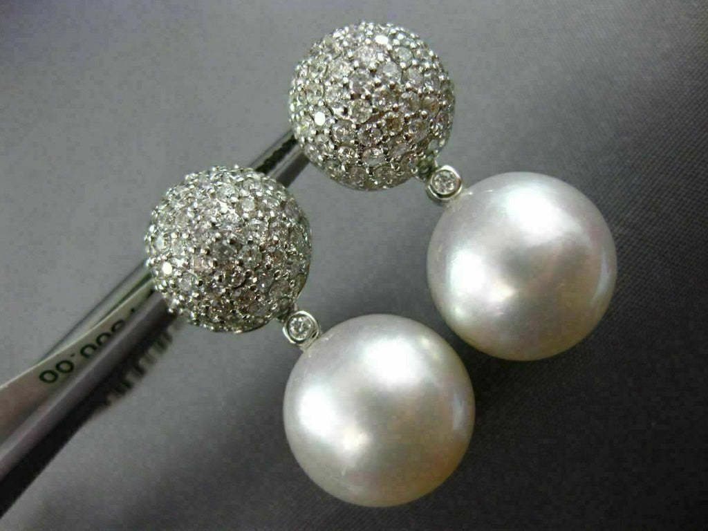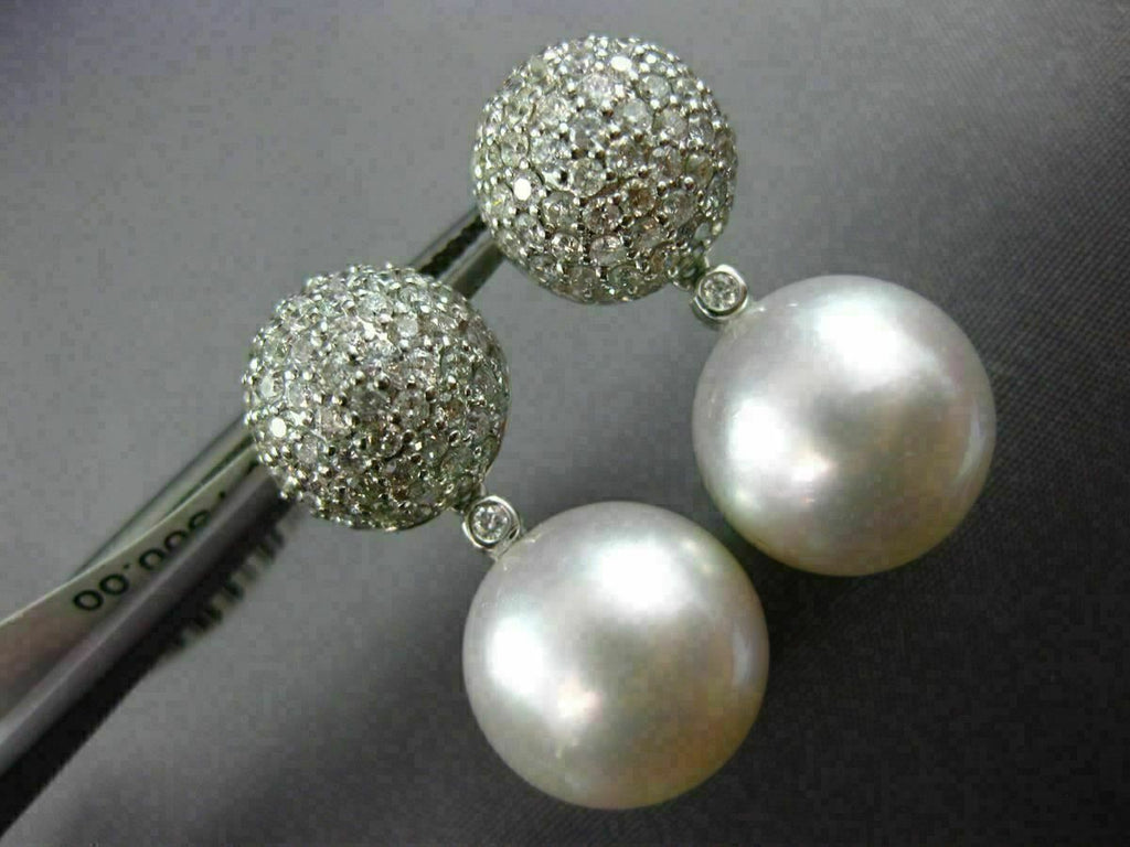 ESTATE LARGE 18KT WHITE GOLD HANGING EARRINGS. 3D CLUSTER PAVE ETOILE DESIGN. DIAMONDS ARE F/G COLOR, VSSI CLARITY 1.56 CARATS. AAA SOUTH SEA PEARL. MEASURES 26MM X 13MM. WRITTEN APPRAISAL AVAILABLE. COMES IN A PRESENTABLE GIFT BOX