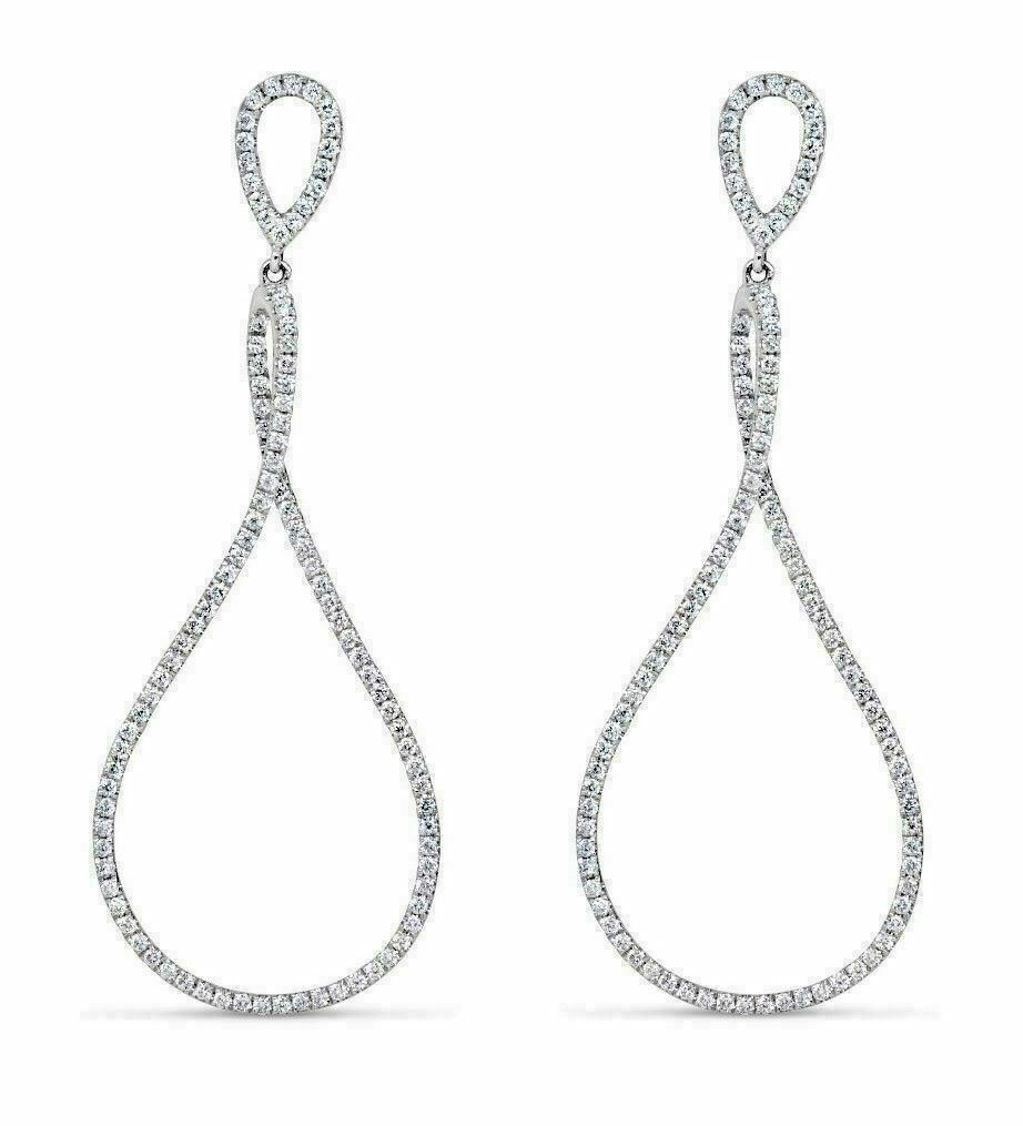 ESTATE LARGE 18KT WHITE GOLD HANGING EARRINGS. 3D TEAR DROP INFINITYDESIGN. DIAMONDS ARE F/G COLOR, VSSI CLARITY 1.58 CARATS. WRITTEN APPRAISAL AVAILABLE. COMES IN A PRESENTABLE GIFT BOX.