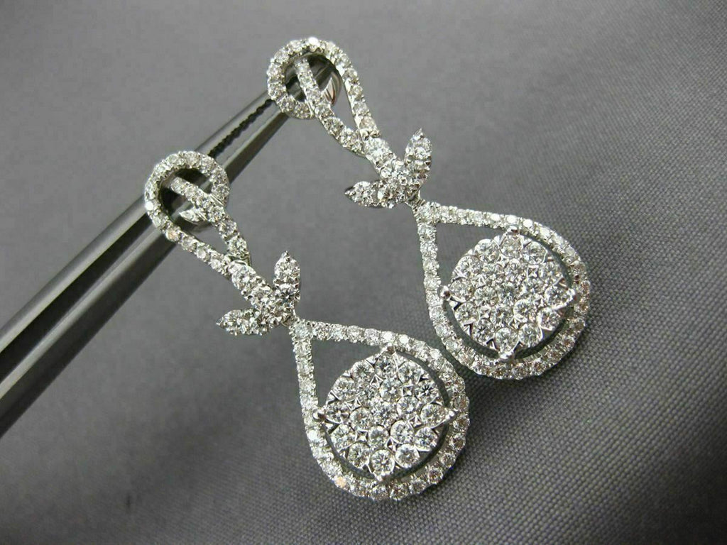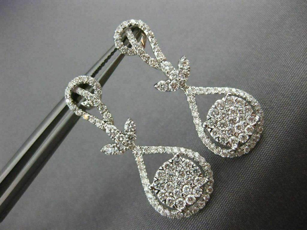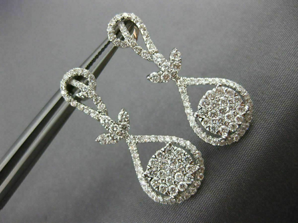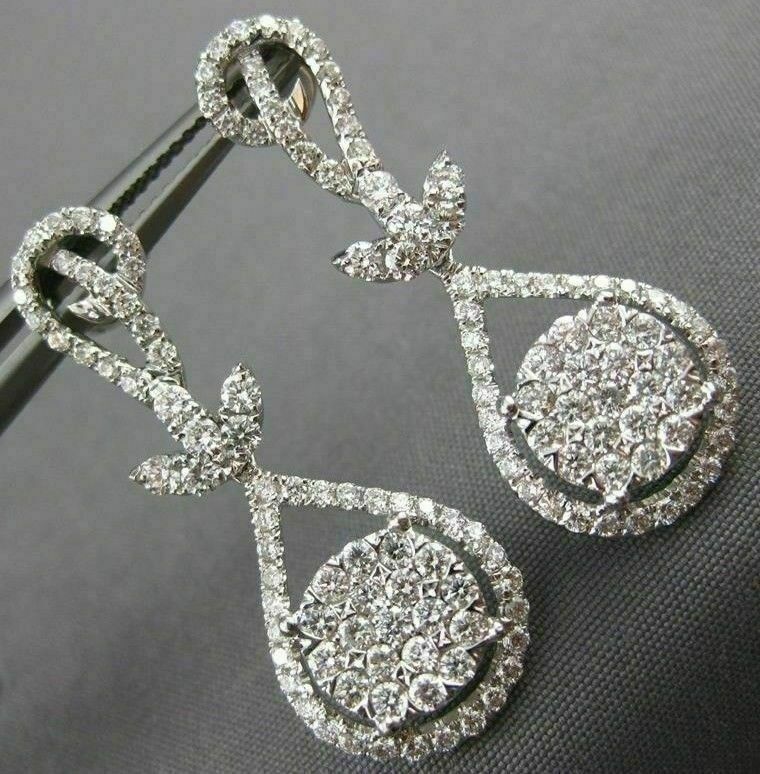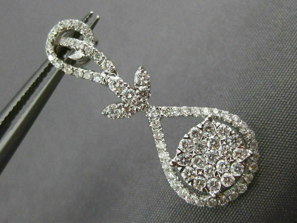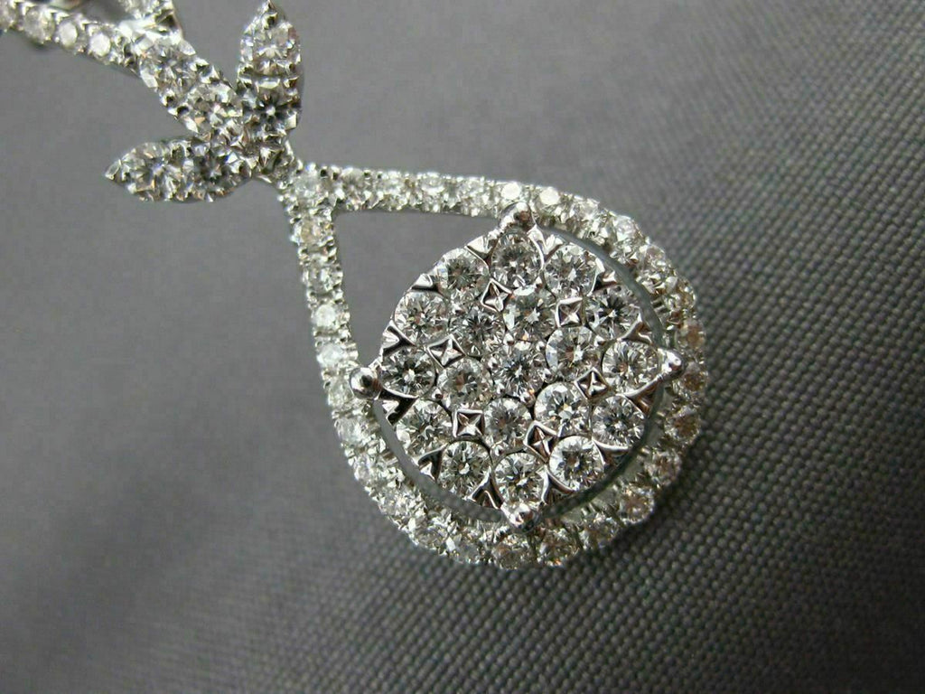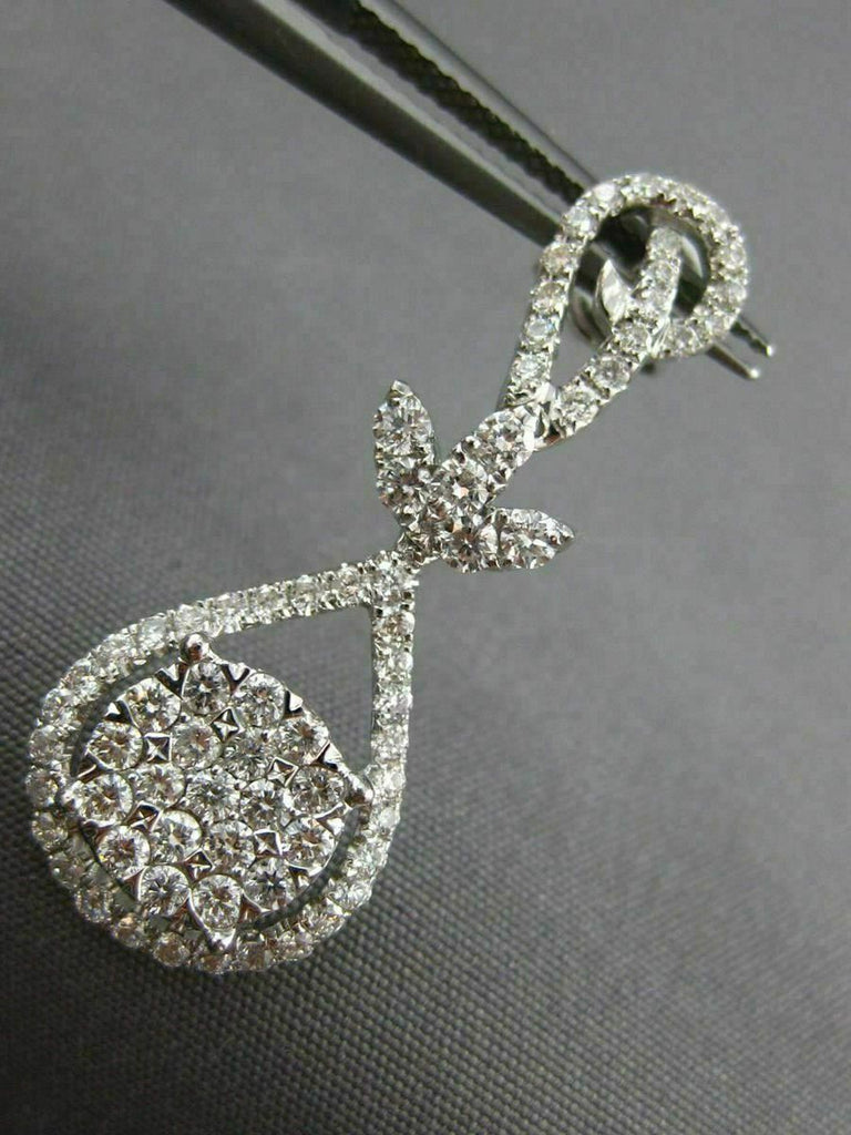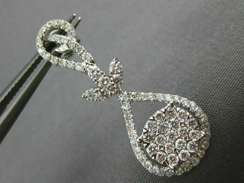 ESTATE LARGE 18KT WHITE GOLD LOVE HANGING EARRINGS. 3D CLUSTER TEAR DROP LEAF DESIGN. DIAMONDS ARE F/G COLOR, VSSI CLARITY 1.63 CARATS. MEASURES 32mm X 12mm. WRITTEN APPRAISAL AVAILABLE. COMES IN A PRESENTABLE GIFT BOX