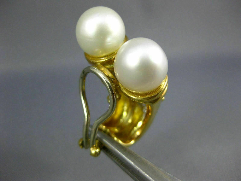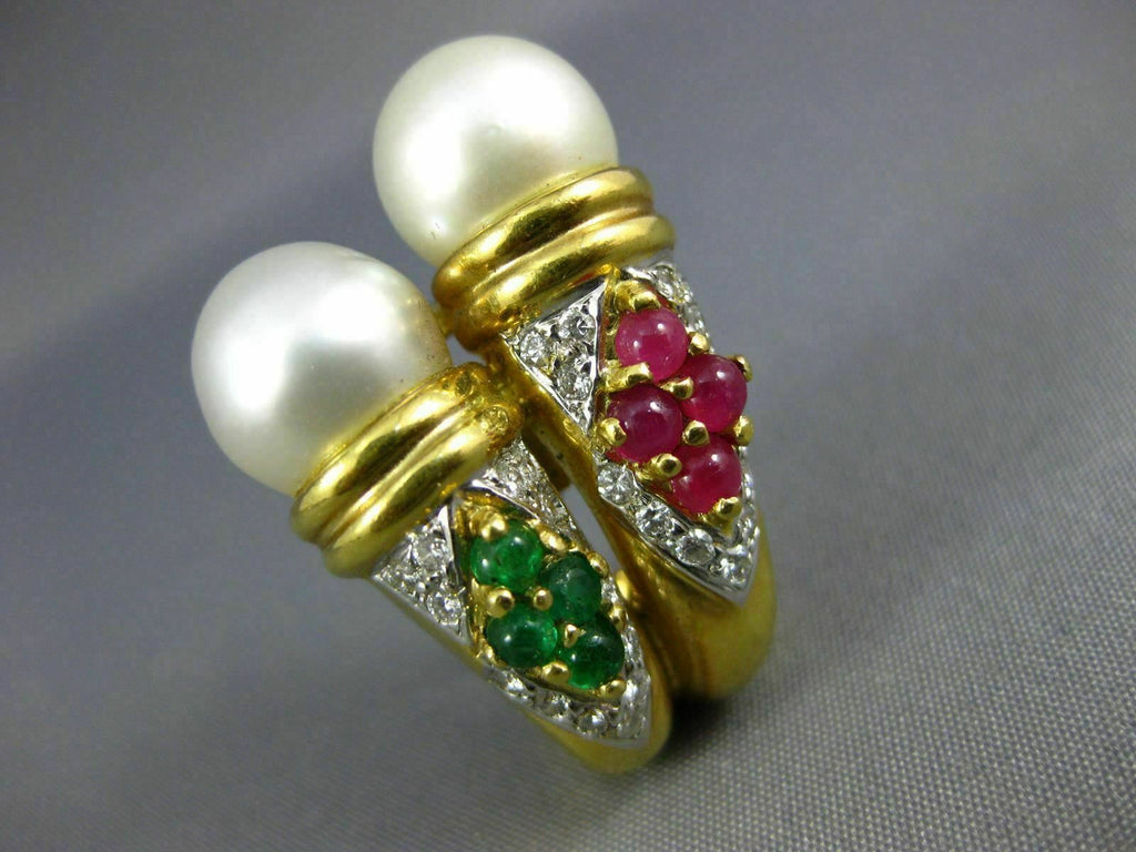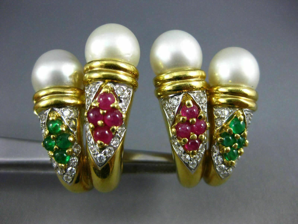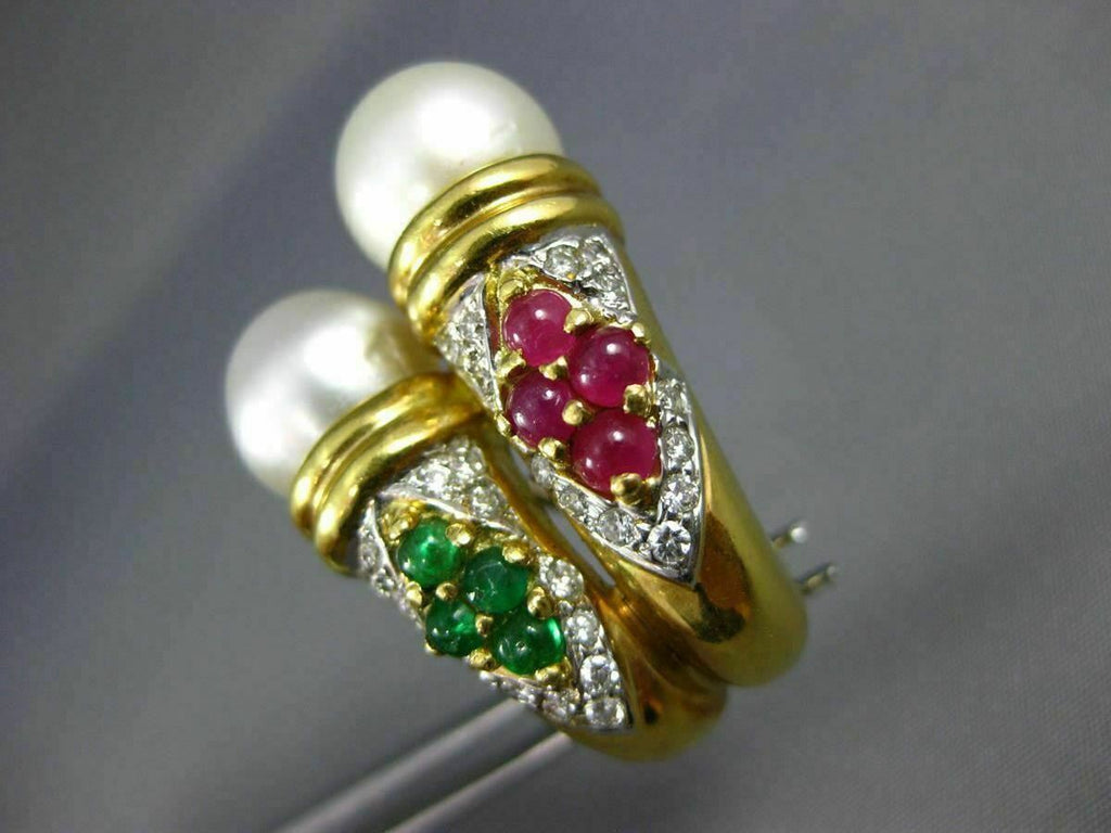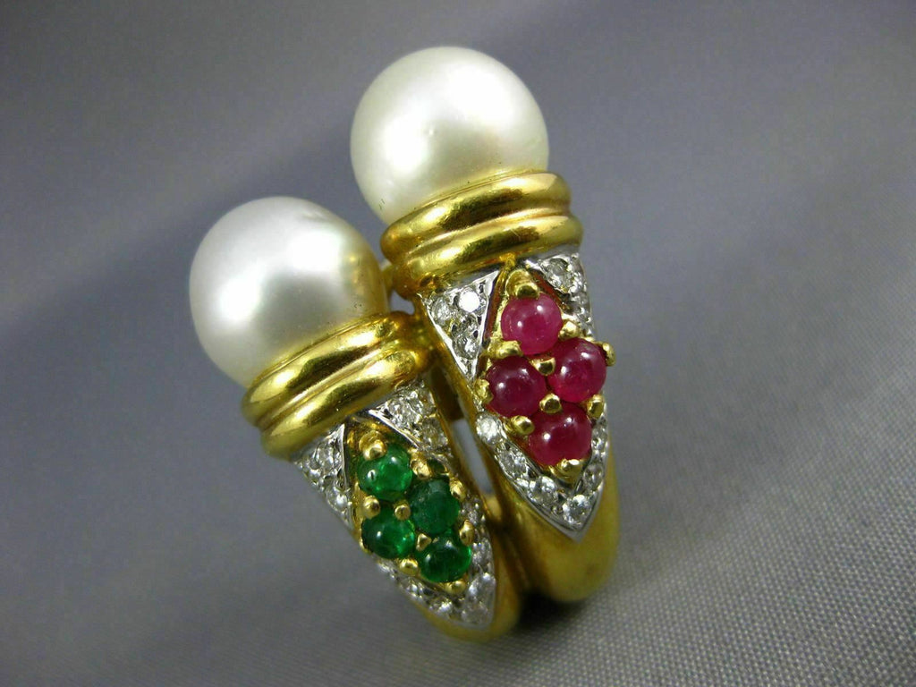 ESTATE EXTRA LARGE 18KT YELLOW GOLD CLIP ON EARRINGS. 3D CLASSIC DESIGN. DIAMONDS ARE F/G COLOR, VVS/VS CLARITY .50 CARATS. AAA RUBIES ARE .60 CARATS. AAA EMERALDS ARE .50 CARATS. FEATURES AAA SOUTH SEA PEARLS. MEASURES 30mm X 20mm. WRITTEN APPRAISAL AVAILABLE. COMES IN A PRESENTABLE GIFT BOX