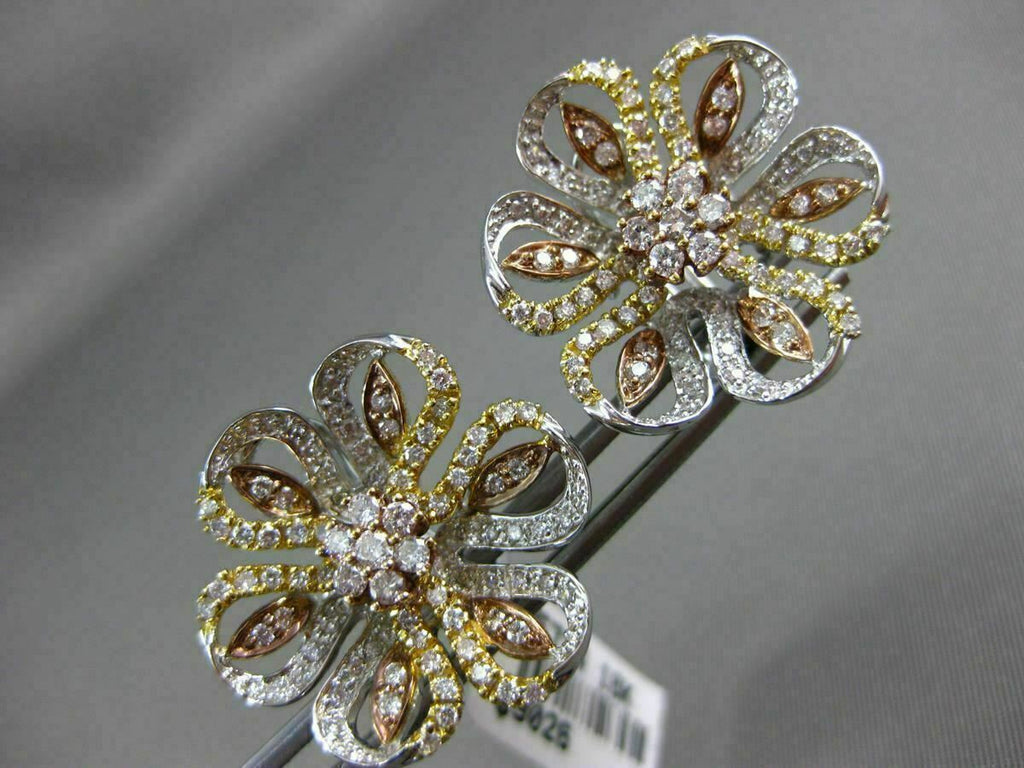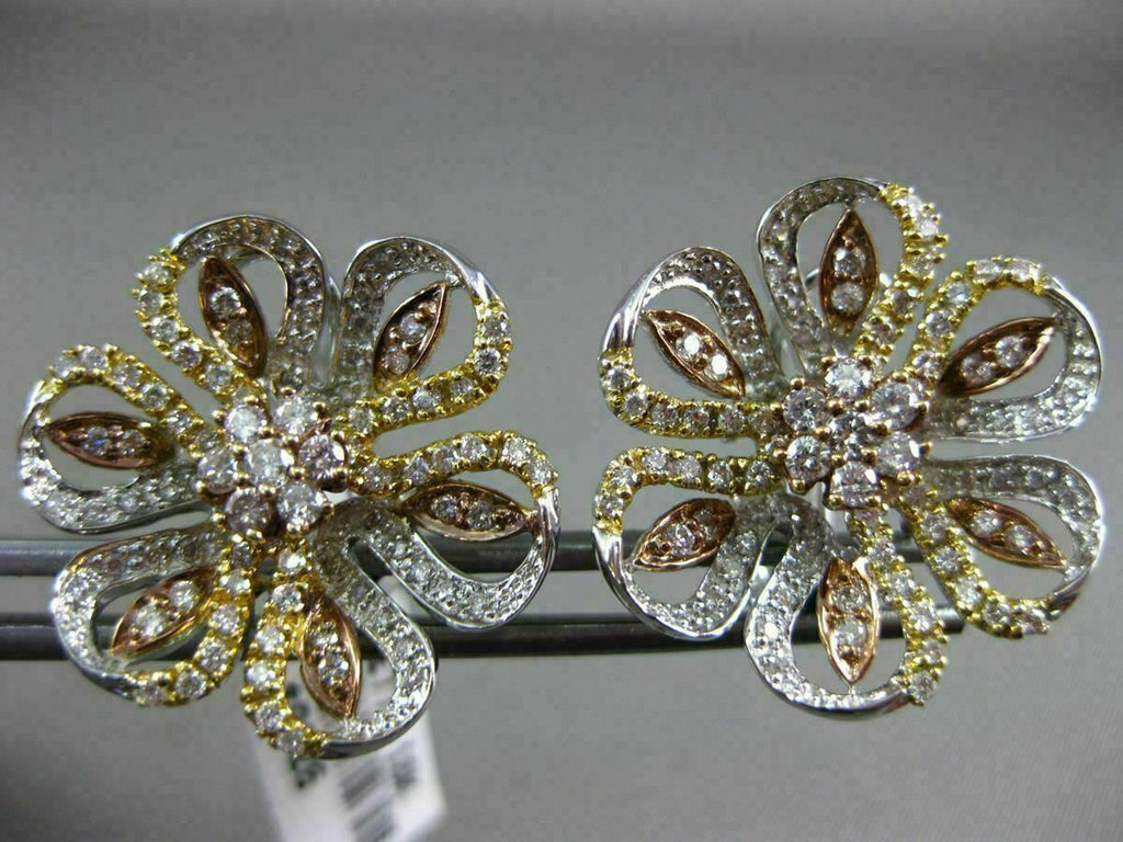 ESTATE LARGE 18KT WHITE, YELLOW AND ROSE GOLD CLIP ON EARRINGS. 3D FLOWER OPEN FILIGREE DESIGN. DIAMONDS ARE F/G COLOR, VSSI CLARITY 1.72 CARATS. MEASURES 22mm X 22mm. WRITTEN APPRAISAL AVAILABLE. COMES IN A PRESENTABLE GIFT BOX