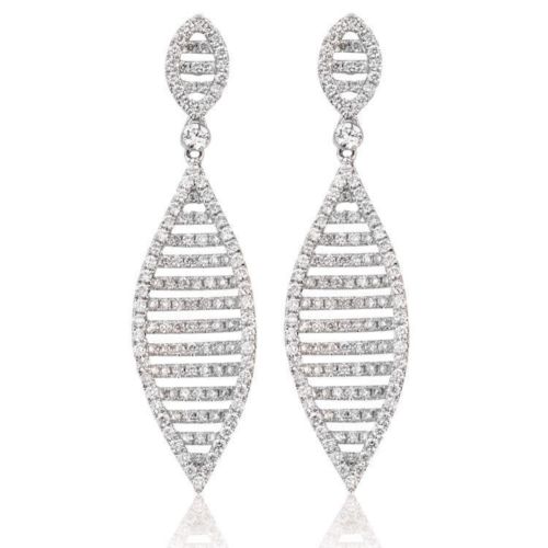 ESTATE LARGE 18KT WHITE GOLD HANGING EARRINGS. 3D MARQUISE SHAPE TEAR DROP ELONGATED DESIGN. DIAMONDS ARE F/G COLOR, VSSI CLARITY 1.76 CARATS. WRITTEN APPRAISAL AVAILABLE. COMES IN A PRESENTABLE GIFT BOX.