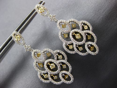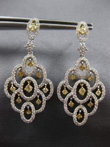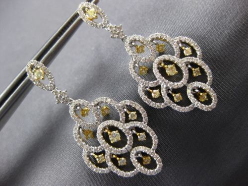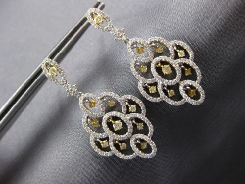 ESTATE LARGE 18KT WHITE AND YELLOW GOLD HANGING EARRINGS. 3D FLOWER CHANDELIER DESIGN. DIAMONDS ARE F/G COLOR, VSSI CLARITY. WHITE DIAMONDS ARE 1.30 CARATS. FANCY YELLOW DIAMONDS ARE .61 CARATS. MEASURES 39mm X 18mm. WRITTEN APPRAISAL AVAILABLE. COMES IN A PRESENTABLE GIFT BOX.