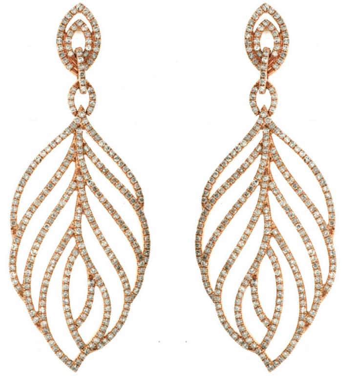 ESTATE LARGE 14KT ROSE GOLD EARRINGS. 3D CLASSIC MULTI LEAF DESIGN. DIAMONDS ARE F/G COLOR, VSSI CLARITY 1.60 CARATS. WRITTEN APPRAISAL AVAILABLE. COMES IN A PRESENTABLE GIFT BOX.