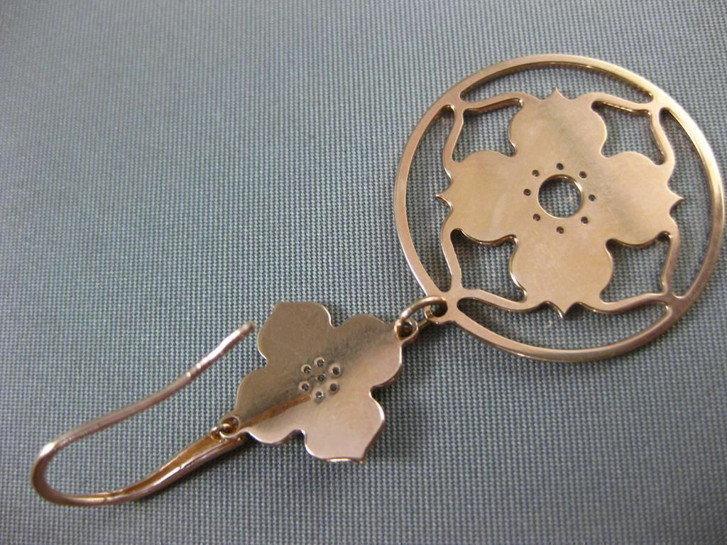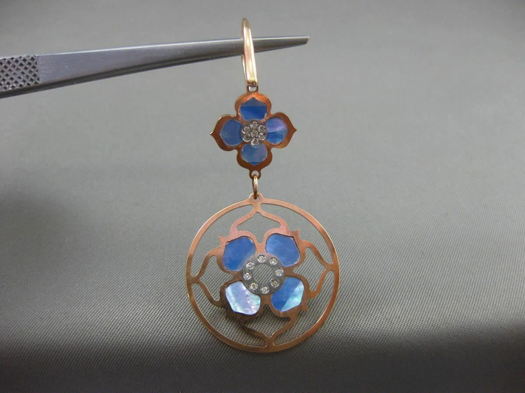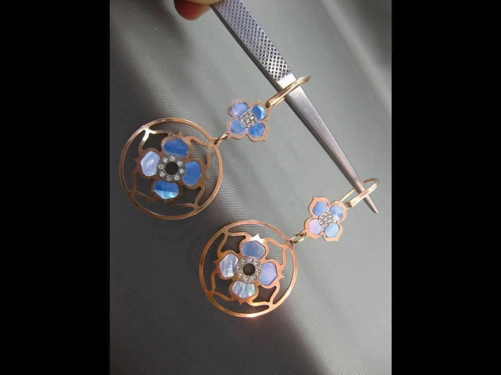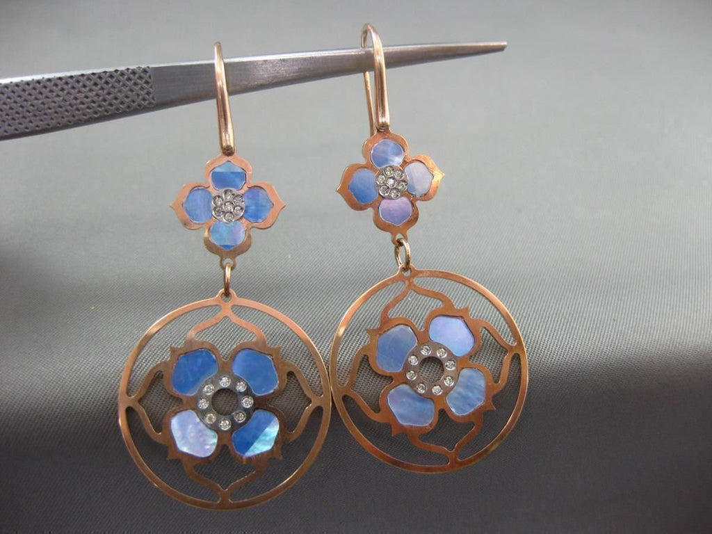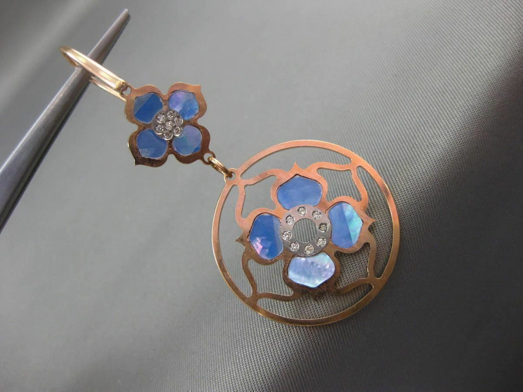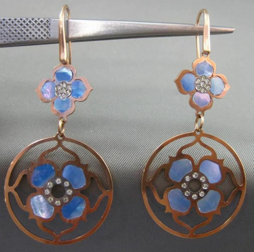 ESTATE LARGE 14KT ROSE GOLD HANGING DROP EARRINGS. 3D ETOILE FLOWER DESIGN. DIAMONDS ARE F/G COLOR, VSSI CLARITY .17 CARATS. CONSISTS AAA BLUE MOTHER OF PEARL. MEASURES 58MM X 26MM WIDE. WRITTEN APPRAISAL AVAILABLE. COMES IN A PRESENTABLE GIFT BOX