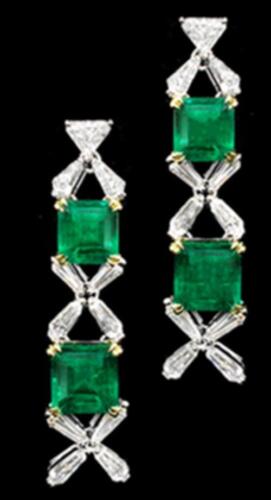 ESTATE LARGE PLATINUM FUN HANGING EARRINGS. 3D CLASSIC DESIGN. TRILLION CUT AND BAGUETTE DIAMONDS ARE F/G COLOR, VVS-VS CLARITY 5.20 CARATS. AAA EMERALD CUT EMERALDS ARE 13.12 CARATS. WRITTEN APPRAISAL AVAILABLE. COMES IN A PRESENTABLE GIFT BOX.