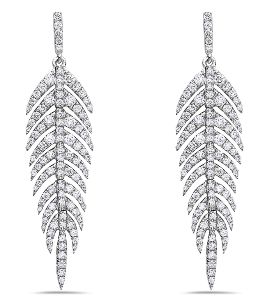 ESTATE LARGE 18KT WHITE GOLD HANGING EARRINGS. 3D CLASSIC MULTI LEAF DESIGN. DIAMONDS ARE F/G COLOR, VSSI CLARITY 1.90 CARATS. WRITTEN APPRAISAL AVAILABLE. COMES IN A PRESENTABLE GIFT BOX.