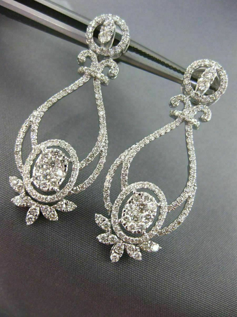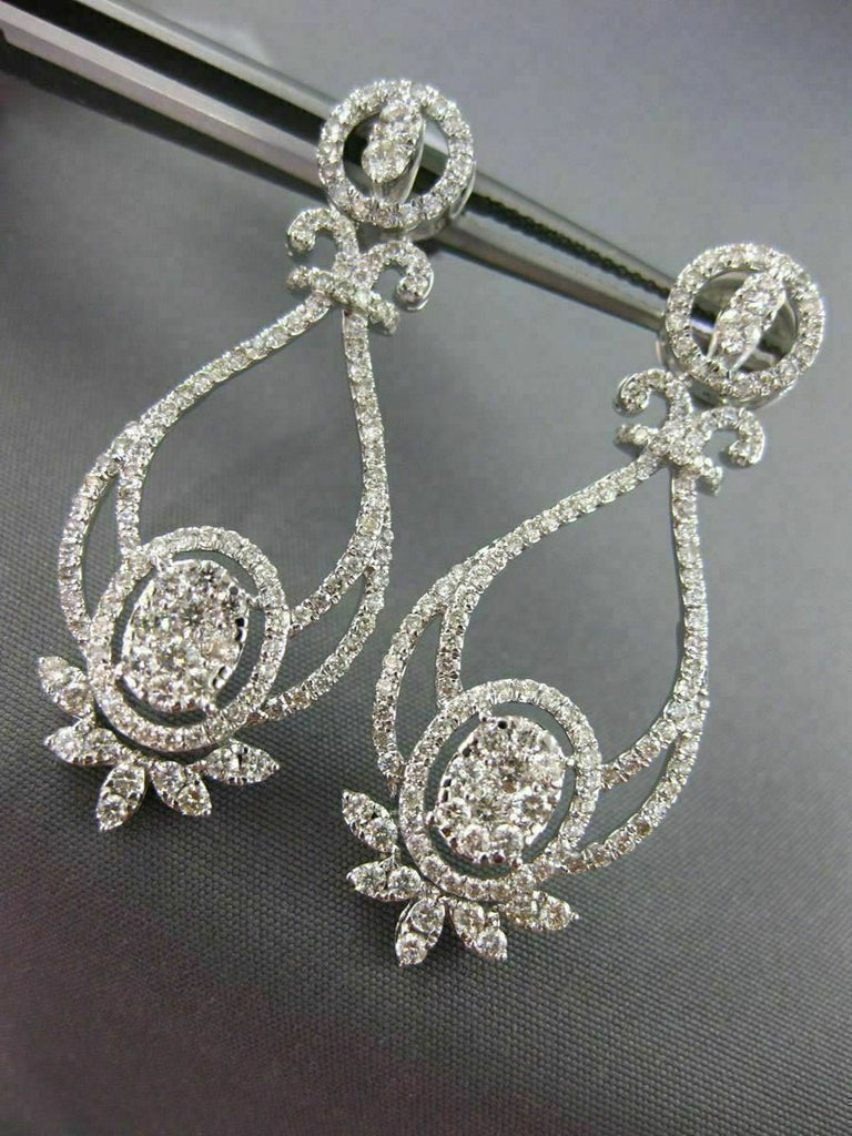 ESTATE LARGE 14KT WHITE GOLD HANGING EARRINGS. 3D OPEN FILIGREE FLOR DE LEES FLOWER DESIGN. DIAMONDS ARE F/G COLOR, VSSI CLARITY 2.02 CARATS. MEASURES 41mm X 16mm. WRITTEN APPRAISAL AVAILABLE. COMES IN A PRESENTABLE GIFT BOX