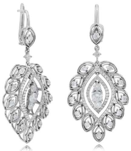 ESTATE LARGE 18KT WHITE GOLD LEVERBACK HANGING EARRINGS. 3D MULTI LEAF FILIGREE TEAR DROP DESIGN. ROUND DIAMONDS ARE F/G COLOR, VSSI CLARITY 2.03 CARATS. WRITTEN APPRAISAL AVAILABLE. COMES IN A PRESENTABLE GIFT BOX.