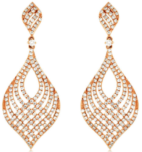 ESTATE LARGE 14KT ROSE GOLD HANGING EARRINGS. 3D TEAR DROP CLASSIC CRISS CROSS DESIGN. DIAMONDS ARE F/G COLOR, VSSI CLARITY 2.15 CARATS. WRITTEN APPRAISAL AVAILABLE. COMES IN A PRESENTABLE GIFT BOX.