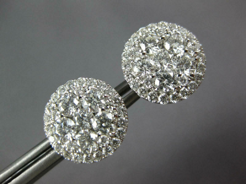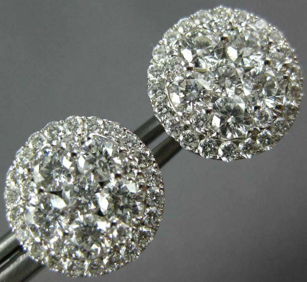 ESTATE LARGE 18KT WHITE GOLD STUDEARRINGS. 3D ROUND CLUSTER FLOWER HALODESIGN.DIAMONDS ARE F/G COLOR, VSSI CLARITY 2.18CARATS. MEASURES 12mm X 33mm.WRITTEN APPRAISAL AVAILABLE. COMES IN A PRESENTABLE GIFT BOX.