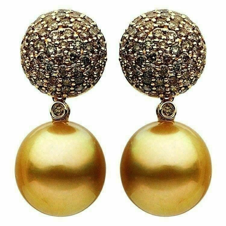 ESTATE LARGE 18KT ROSE GOLD HANGING EARRINGS. 3D PAVE CLUSTER DESIGN. MOCHA DIAMONDS ARE 2.12 CARATS. AAA GOLDEN SOUTH SEA PEARLS ARE 11-12MM WIDE. WRITTEN APPRAISAL AVAILABLE. COMES IN A PRESENTABLE GIFT BOX.