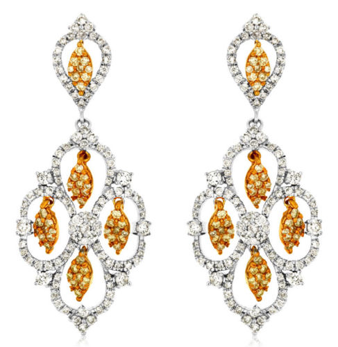ESTATE LARGE 14KT WHITE AND YELLOW GOLD HANGING EARRINGS. 3D FLOWER TEAR DROP CHANDELIER DESIGN. DIAMONDS ARE F/G COLOR, VSSI CLARITY 1.55 CARATS. FANCY YELLOW DIAMONDS ARE .75 CARATS. WRITTEN APPRAISAL AVAILABLE. COMES IN A PRESENTABLE GIFT BOX.