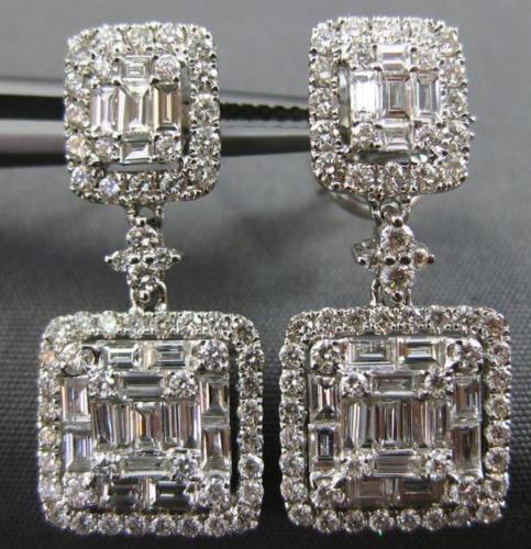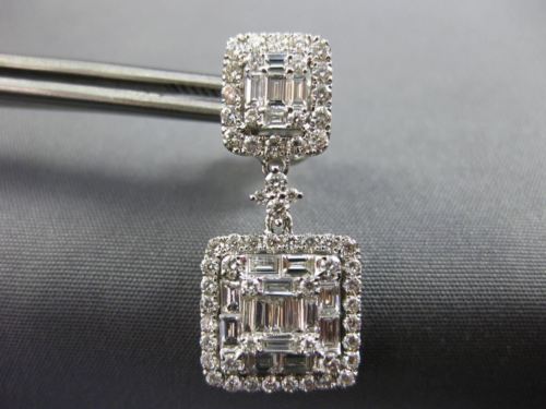 ESTATE LARGE 18KT WHITE GOLD HANGING EARRINGS. 3D CLUSTER SQUARE JOURNEY DESIGN. DIAMONDS ARE F/G COLOR, VSSI CLARITY 2.32 CARATS. MEASURES 27mm X 11mm. WRITTEN APPRAISAL AVAILABLE. COMES IN A PRESENTABLE GIFT BOX.
