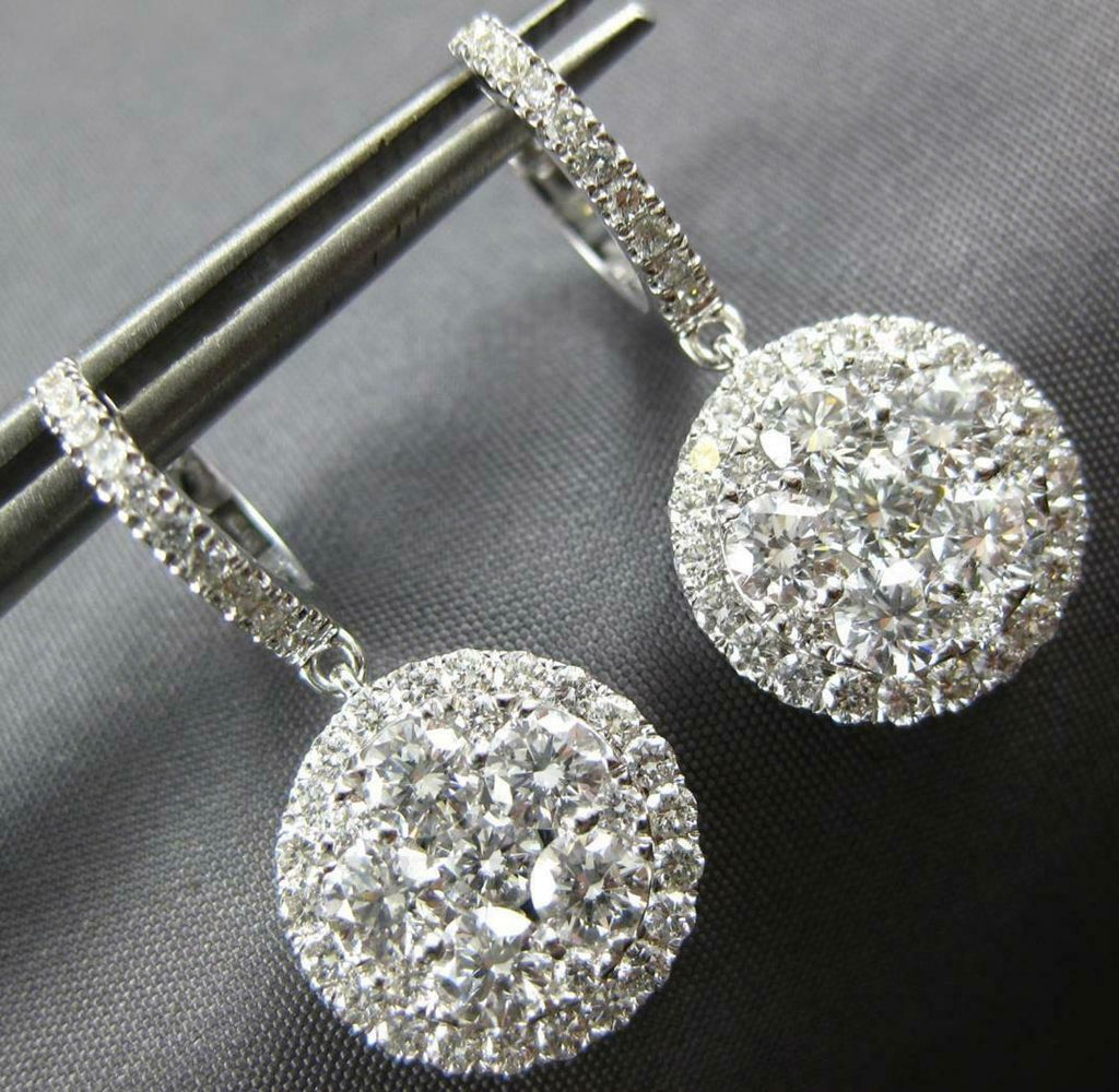 ESTATE LARGE18KT WHITEGOLD HANGING EARRINGS. 3D CLASSIC ROUND CLUSTER FLOWER HALODESIGN. ROUND DIAMONDS ARE F/G COLOR, VSSI CLARITY 2.39 CARATS.MEASURES 26mm X 12mm. WRITTEN APPRAISAL AVAILABLE. COMES IN A PRESENTABLE GIFT BOX.