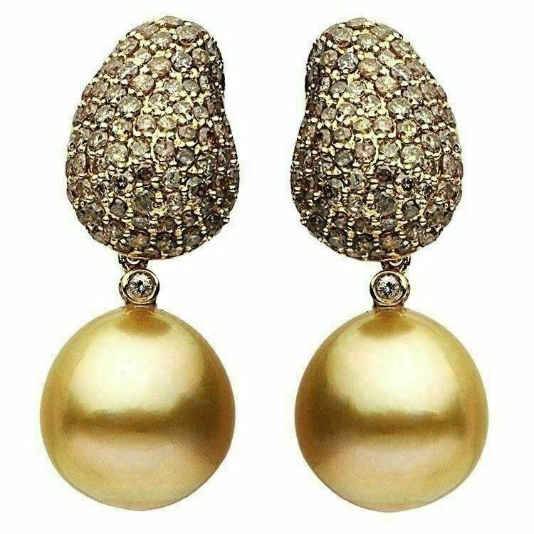 ESTATE LARGE 18KT YELLOW GOLD HANGING EARRINGS. 3D ROUND CLUSTER BEZEL TEAR DROP DESIGN. MOCHA DIAMONDS ARE 2.50 CARATS. AAA GOLDEN SOUTH SEA PEARLS ARE 13-14MM WIDE. WRITTEN APPRAISAL AVAILABLE. COMES IN A PRESENTABLE GIFT BOX.