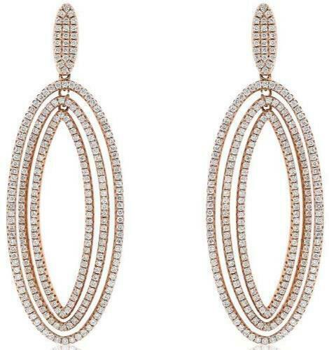 ESTATE LARGE 14KT ROSEGOLD FUN HANGINGEARRINGS. 3D MULTI ROWDESIGN. DIAMONDS ARE F/G COLOR, VSSI CLARITY 2.55 CARATS. WRITTEN APPRAISAL AVAILABLE. COMES IN A PRESENTABLE GIFT BOX.