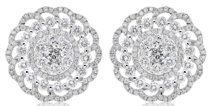 ESTATE LARGE18KT WHITEGOLD STUDEARRINGS. 3D FLOWER CLUSTERDESIGN. DIAMONDS ARE F/G COLOR, VSSI CLARITY 2.69 CARATS. WRITTEN APPRAISAL AVAILABLE. COMES IN A PRESENTABLE GIFT BOX.